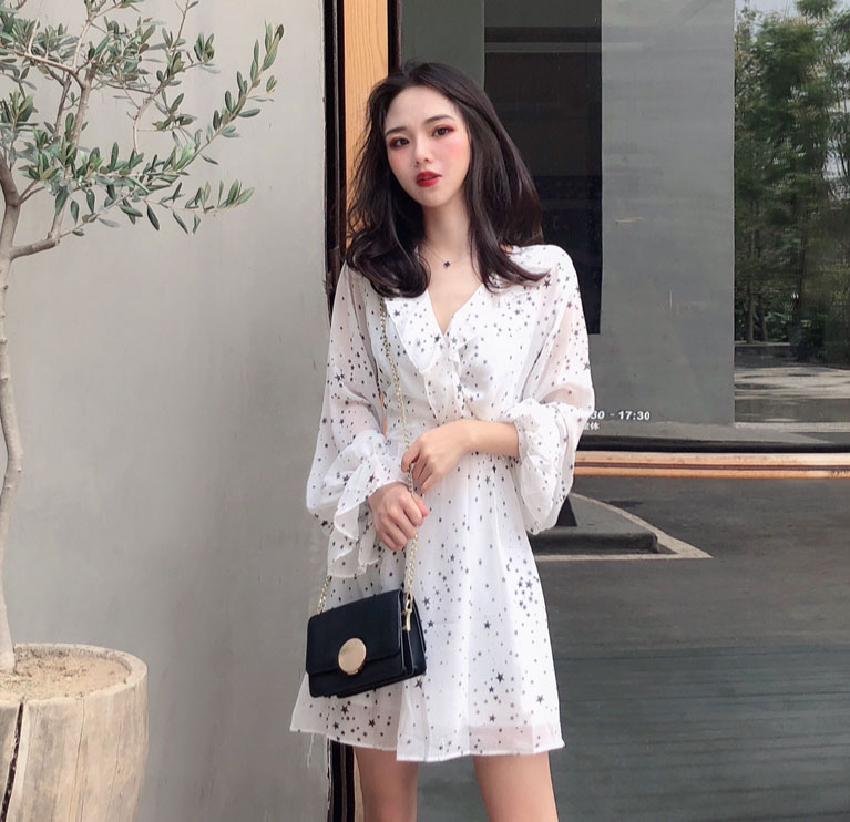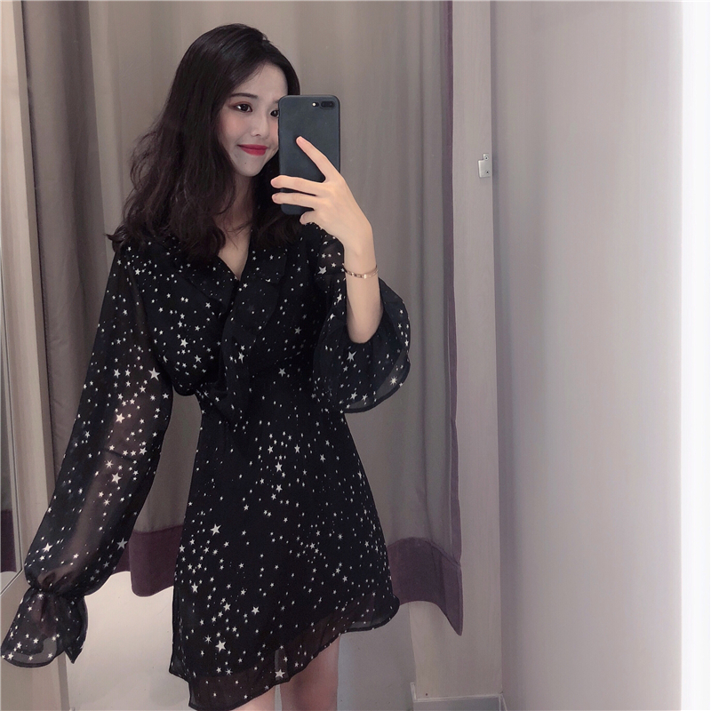 秋裝女2018新款韓版百搭荷葉邊顯瘦不規則v領收腰星星雪紡連衣裙
