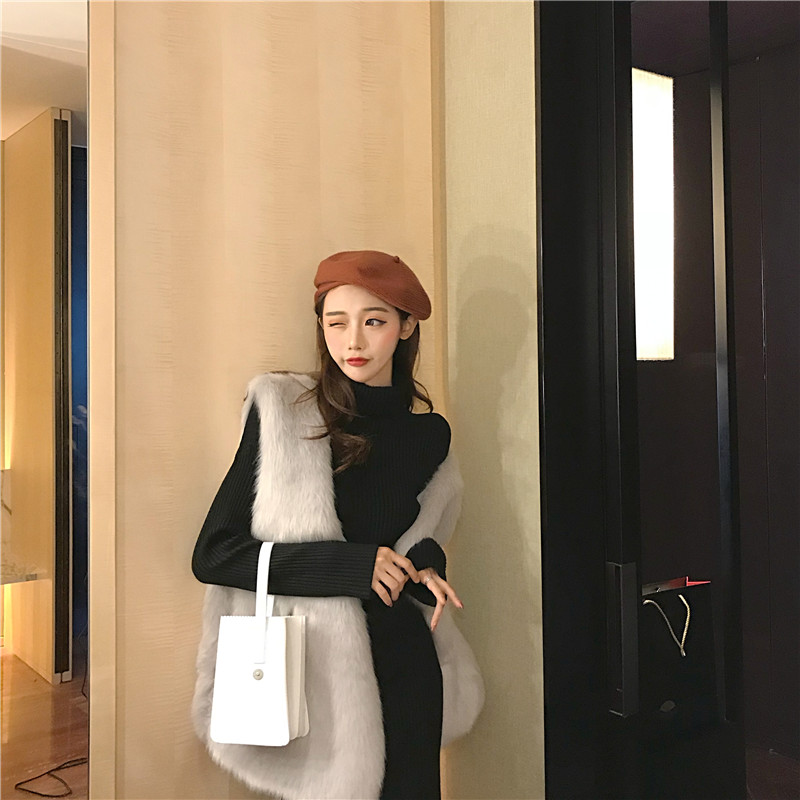 女神套裝秋長袖打底小高領T恤+羊圈毛呢背心馬甲+針織半裙三件套