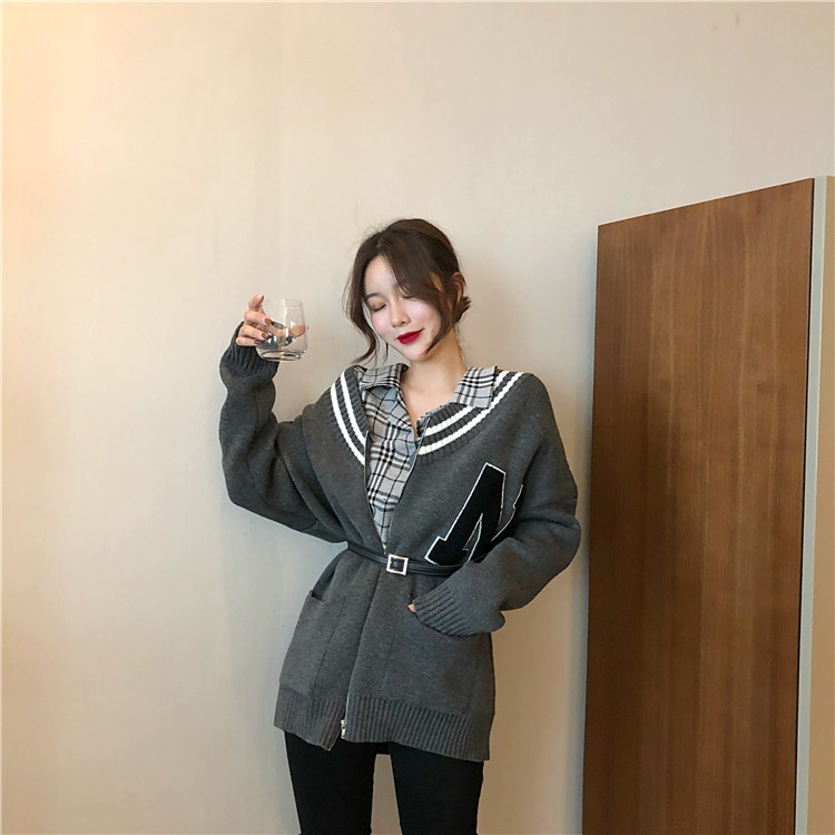 / 復古韓國chic風寬松V領棒球針織毛衣女2018新款N字母拉鏈開衫外套