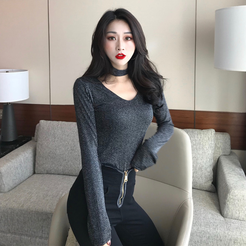 / 學生百搭V領長袖T恤女秋冬裝2018新款韓版套頭鏤空修身顯瘦打底衫
