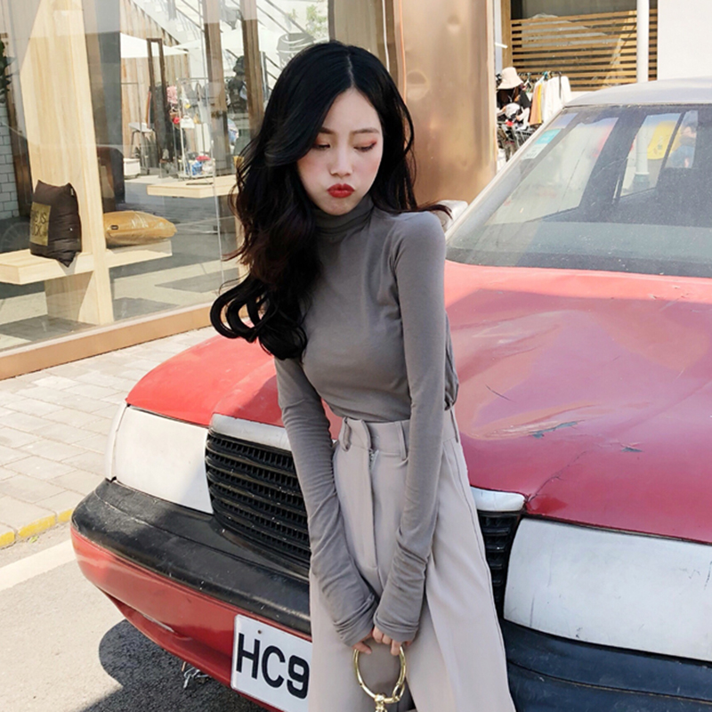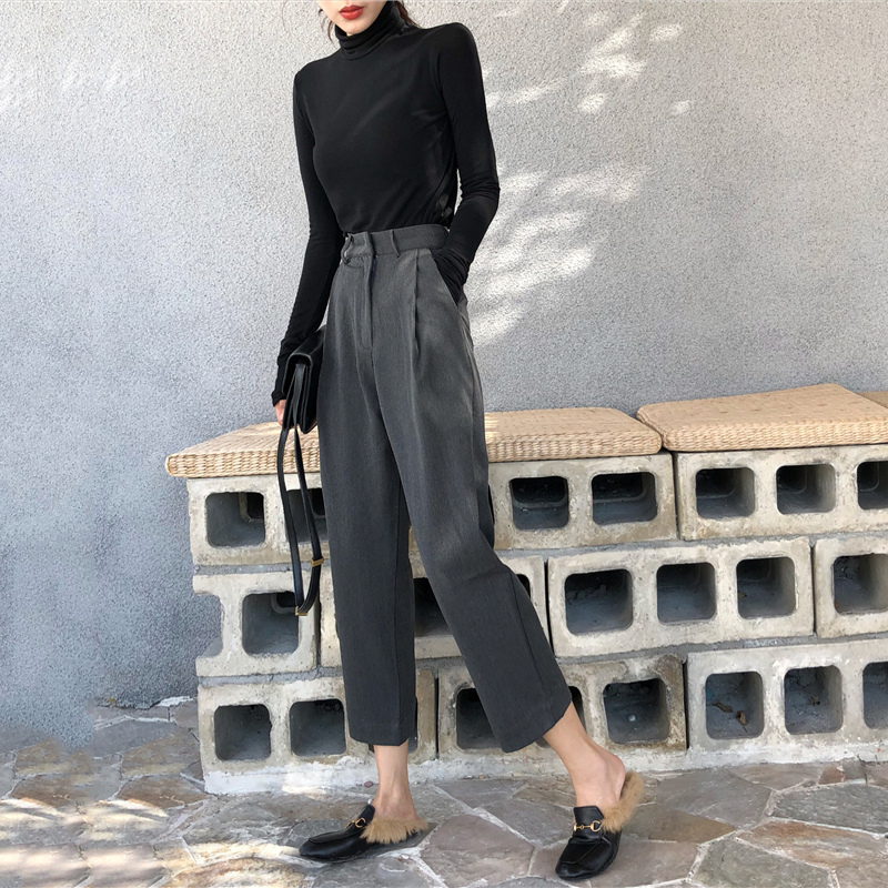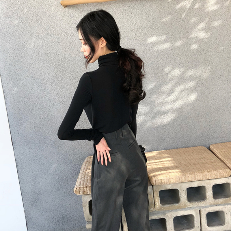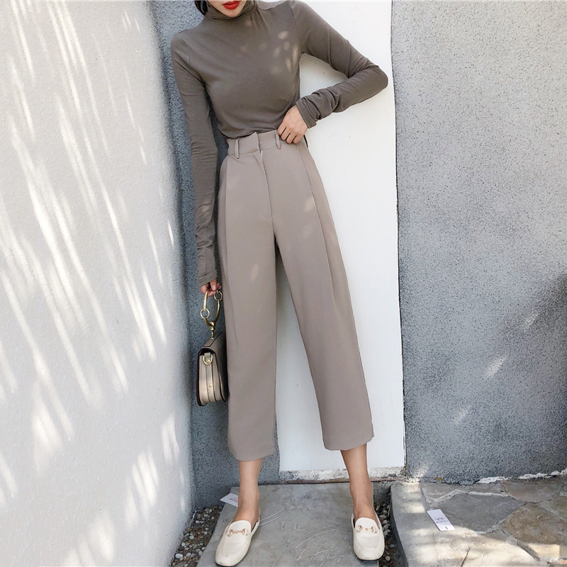/ 套裝女秋季新款修身高領打底衫T恤上衣chic寬松高腰直筒西裝褲子