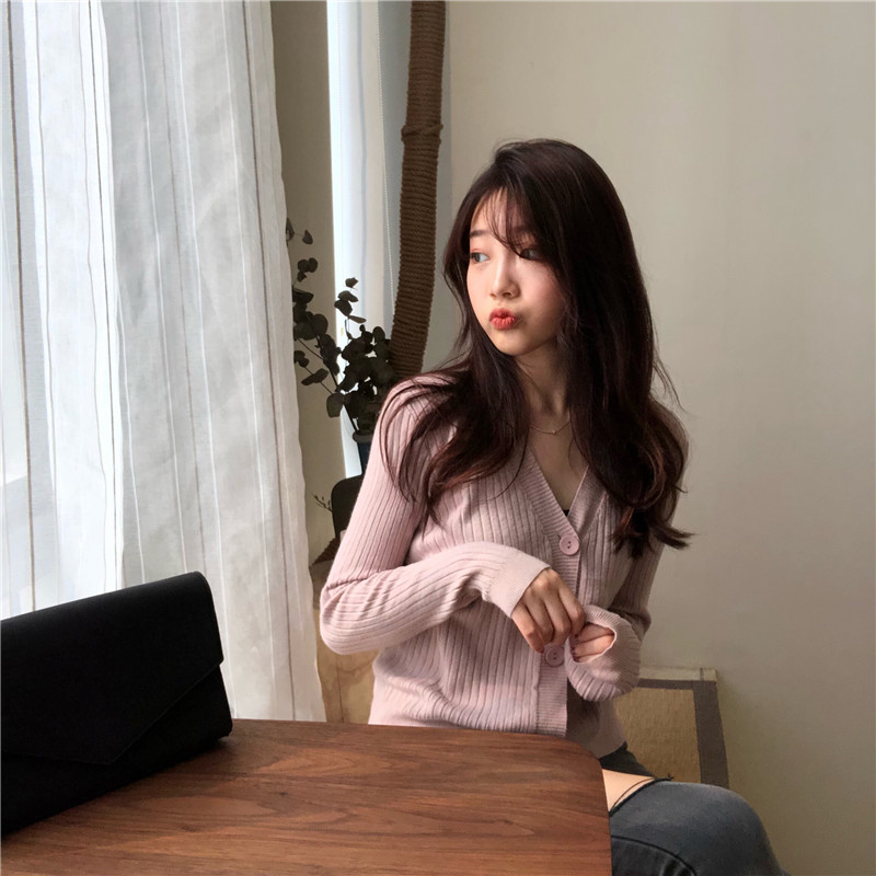 / 韓版寬松百搭V領針織開衫秋季毛衣外搭氣質長袖高腰短款小外套潮
