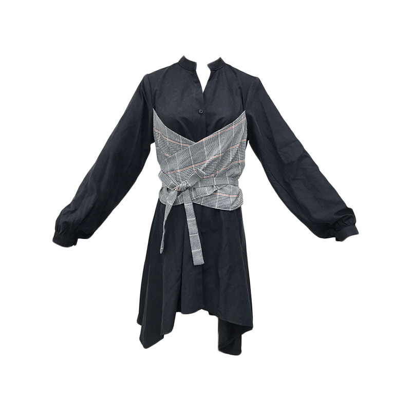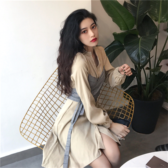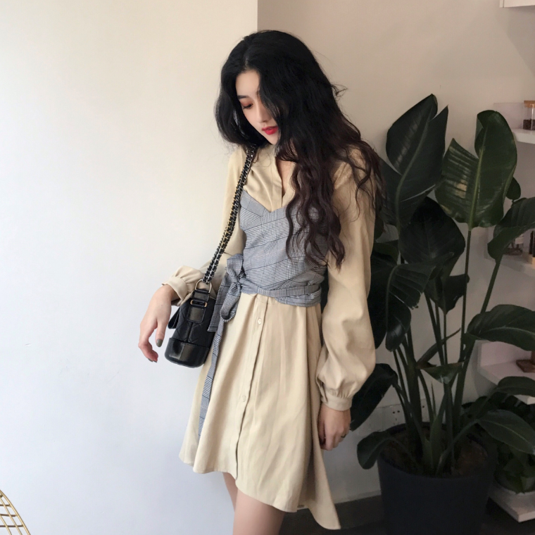秋裝女2018新款氣質百搭收腰顯瘦假兩件格子拼接交叉系帶連衣裙潮