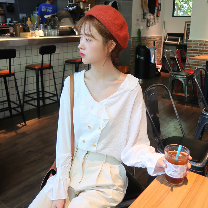 簡約喇叭長袖白襯衫秋裝2018新款韓版少女小清新襯衣休閑打底上衣