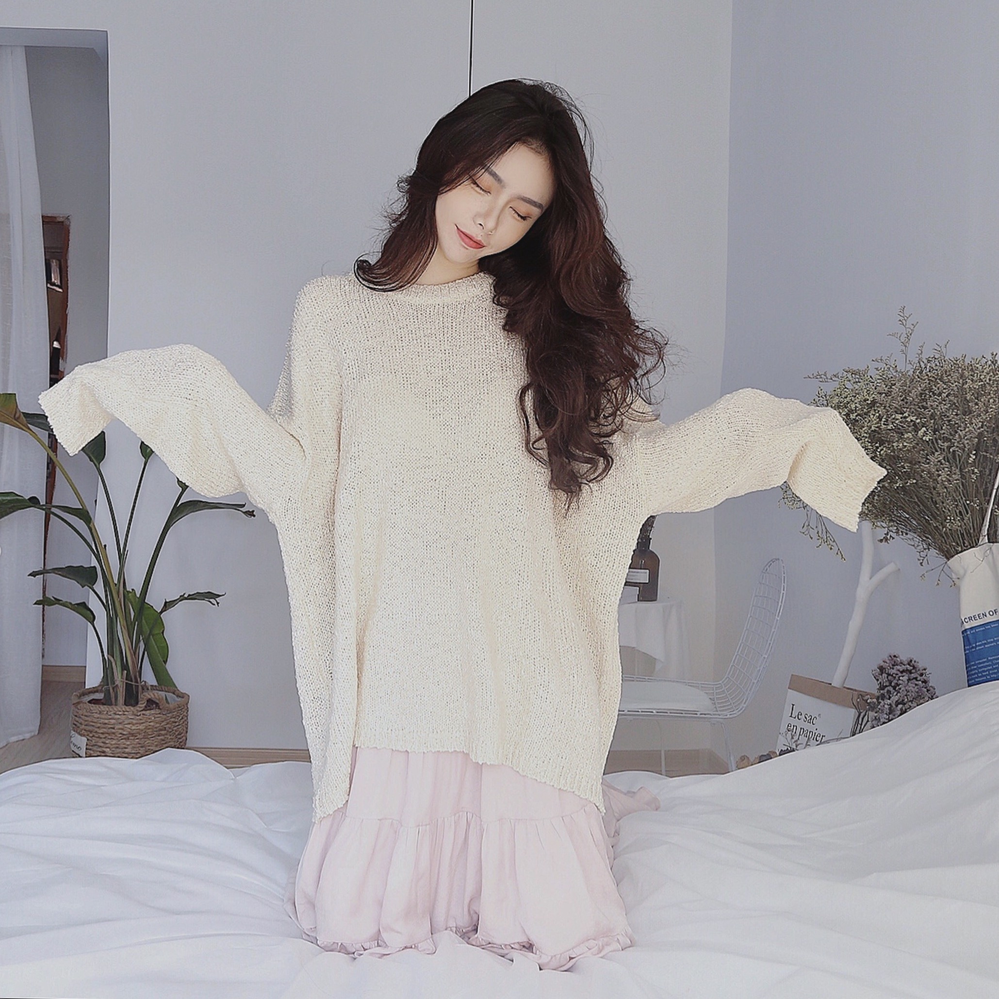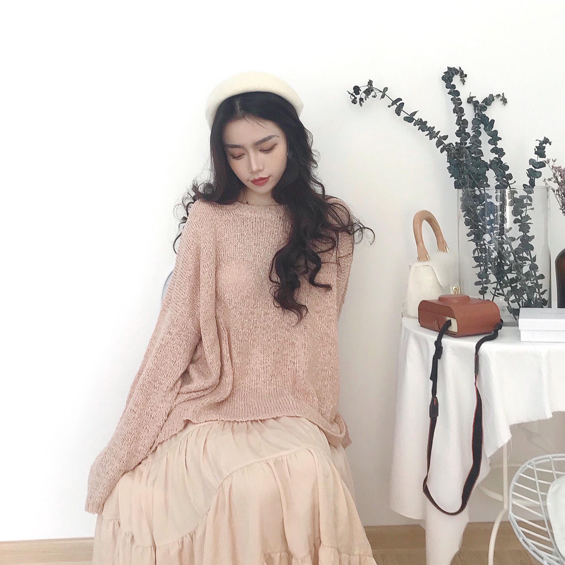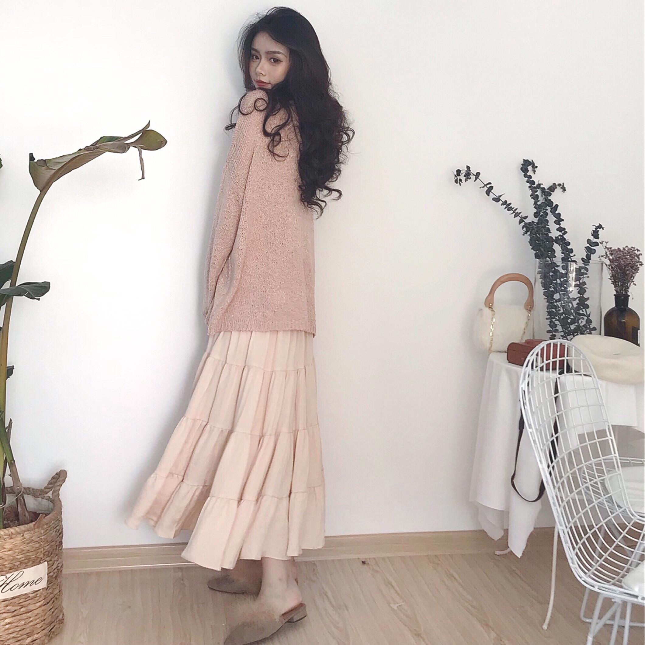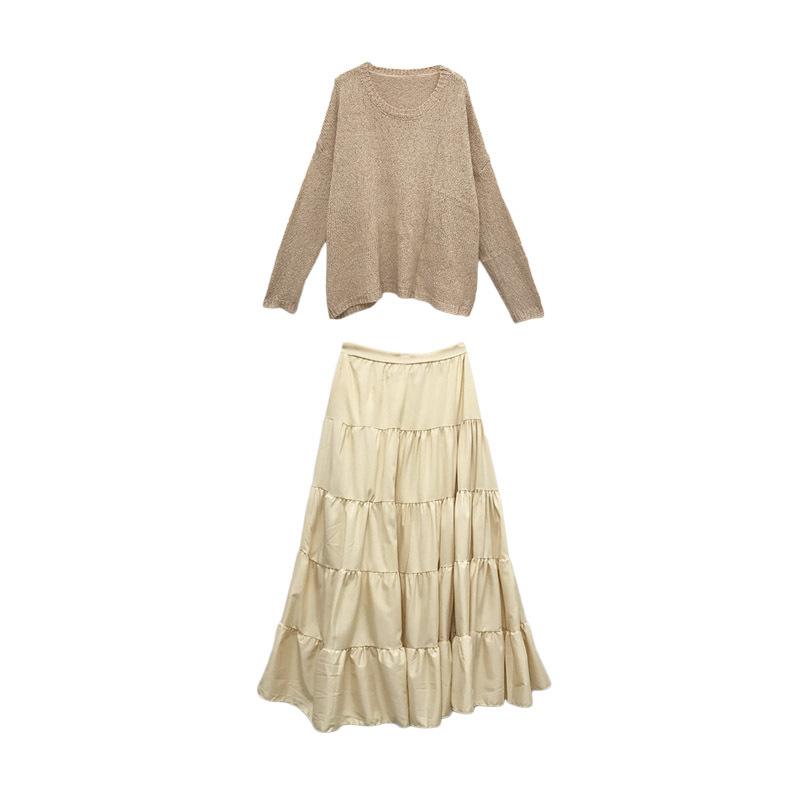 chic早秋上衣慵懶套頭寬松針織衫毛衣+溫柔百搭中長款半身蛋糕裙