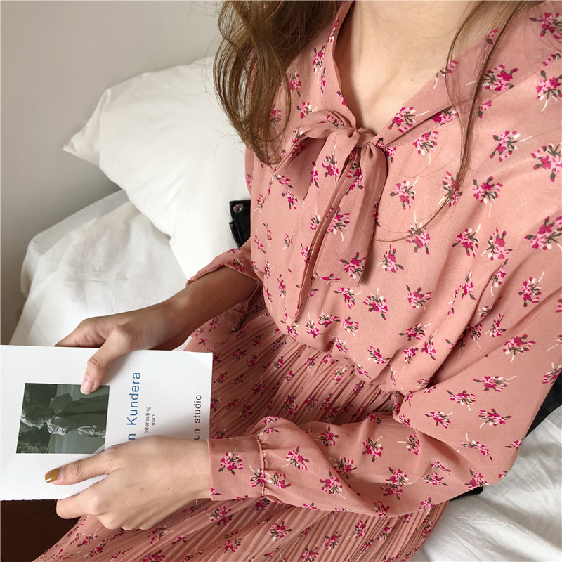 秋裝女2018新款法式少女茶歇裙百褶碎花雪紡連衣裙長裙女秋冬學生