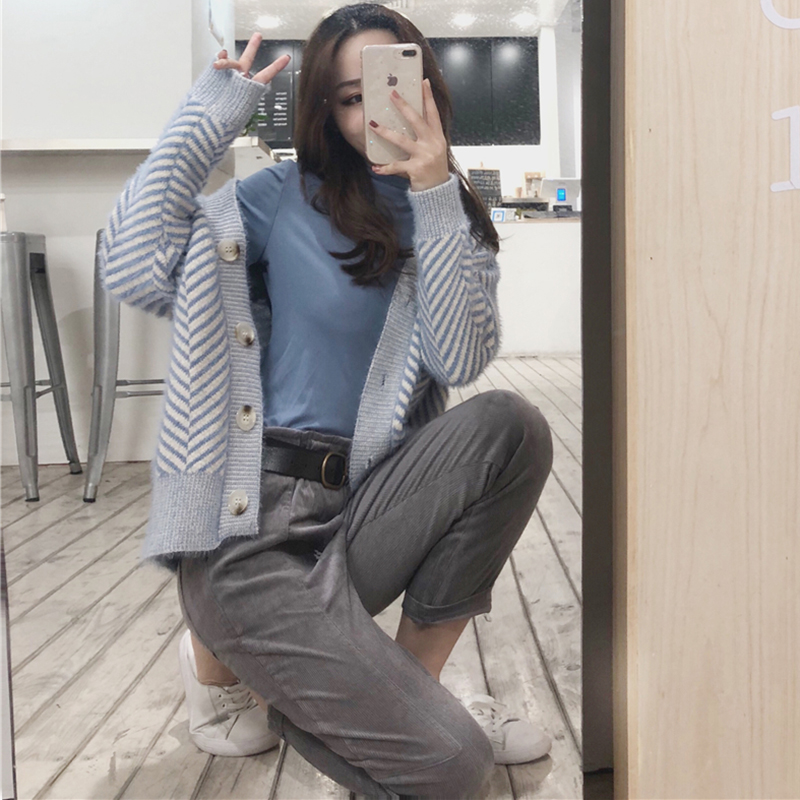 / 條紋針織開衫毛衣外套T恤打底衫高腰休閑褲子三件套裝女秋冬新款
