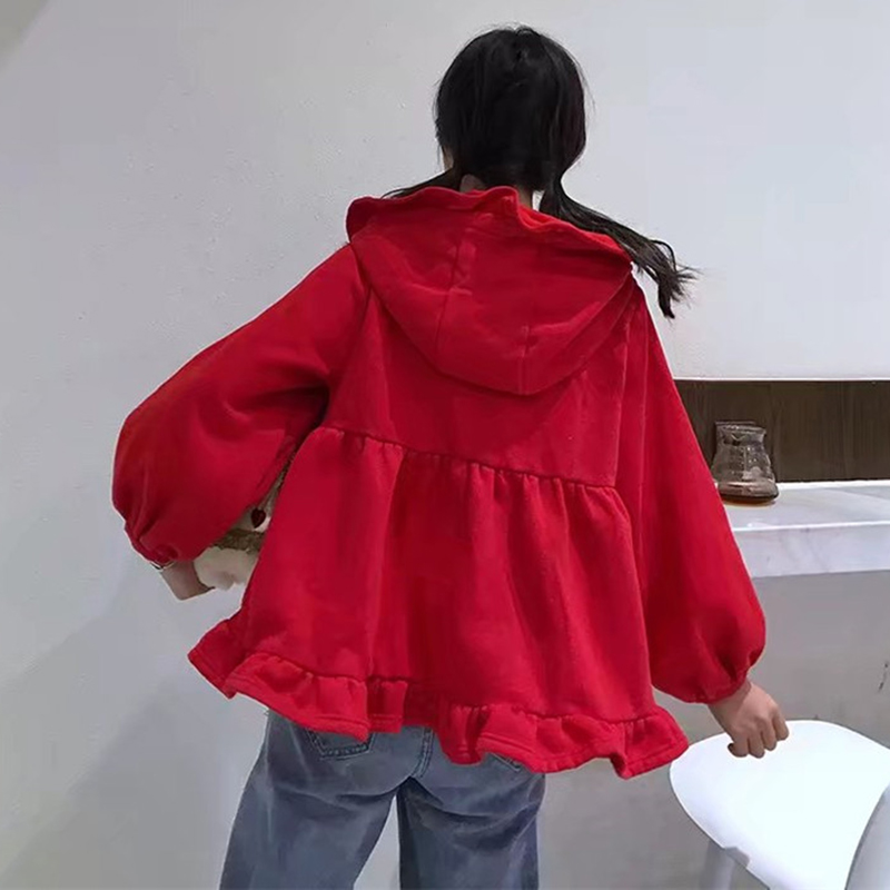 可愛少女泡泡長袖加絨衛衣秋冬裝2018新款學生甜美荷葉邊連帽外套