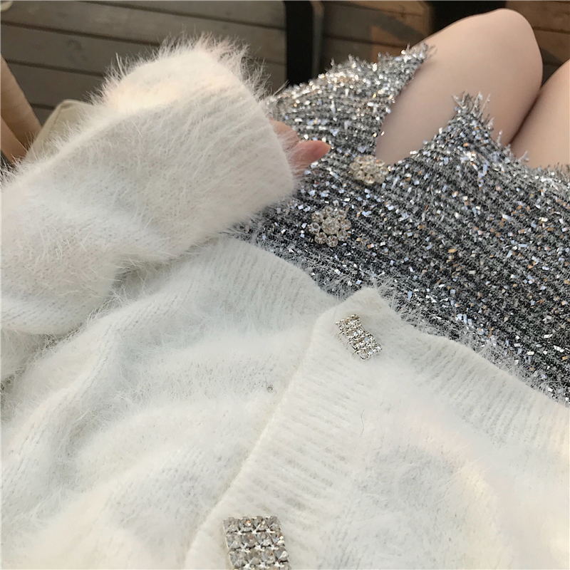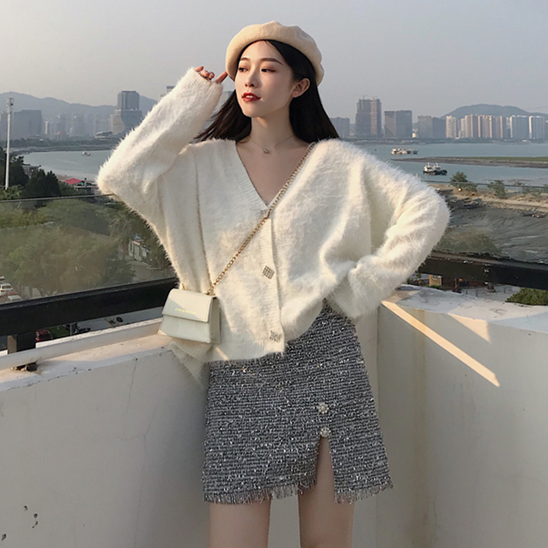 / 毛衣配裙子兩件套秋冬女裝新款慵懶針織外套亮絲開叉高腰顯瘦短裙