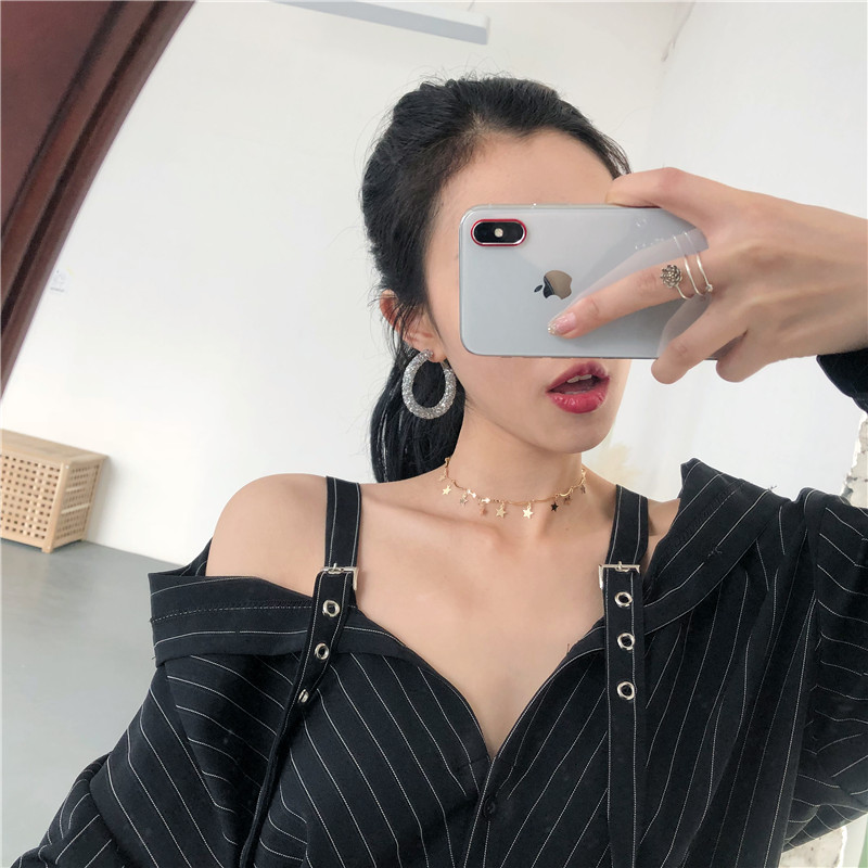 / 夏季新款女裝個性吊帶豎條紋露肩寬松顯瘦學生百搭長袖襯衫上衣女
