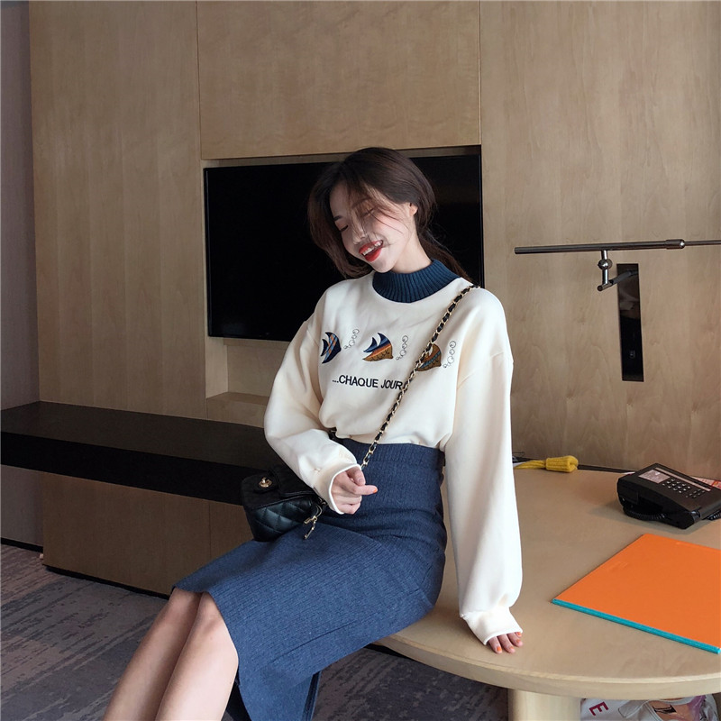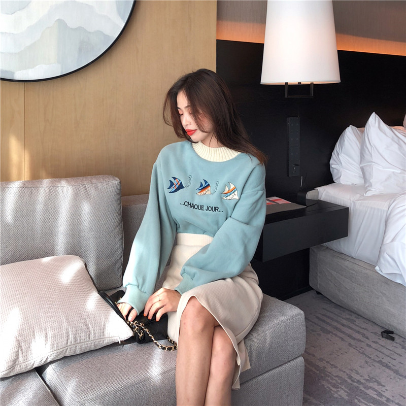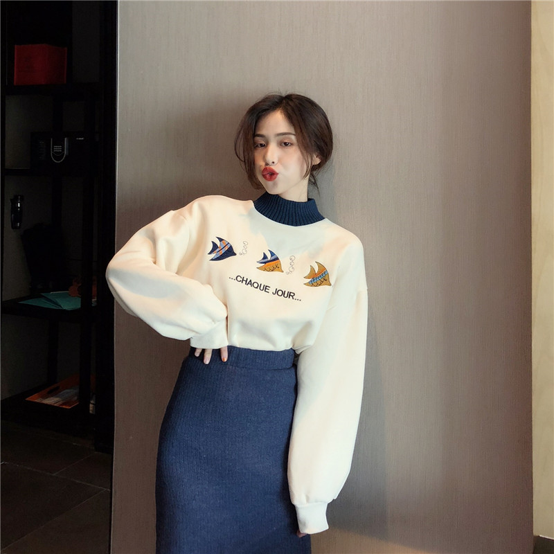 秋裝女2018新款簡約刺繡小魚加絨衛衣女上衣+顯瘦針織半身裙套裝