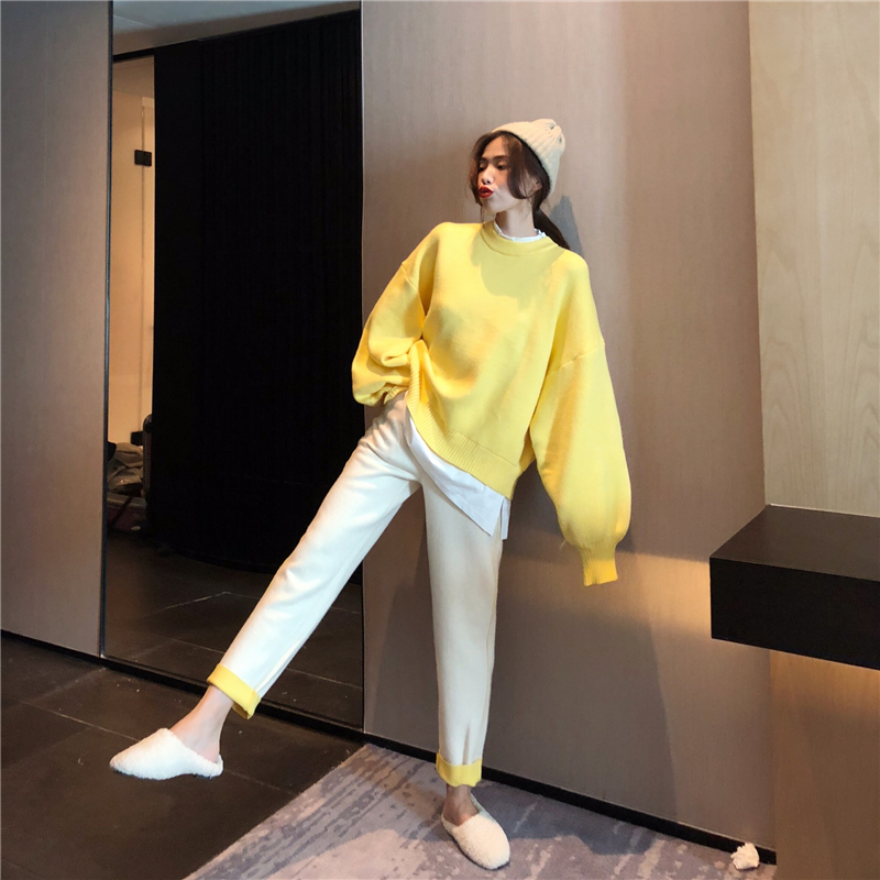 / 燈籠袖假兩件拼接毛衣女秋冬2018新款潮+撞色復合寬松蘿卜褲套裝