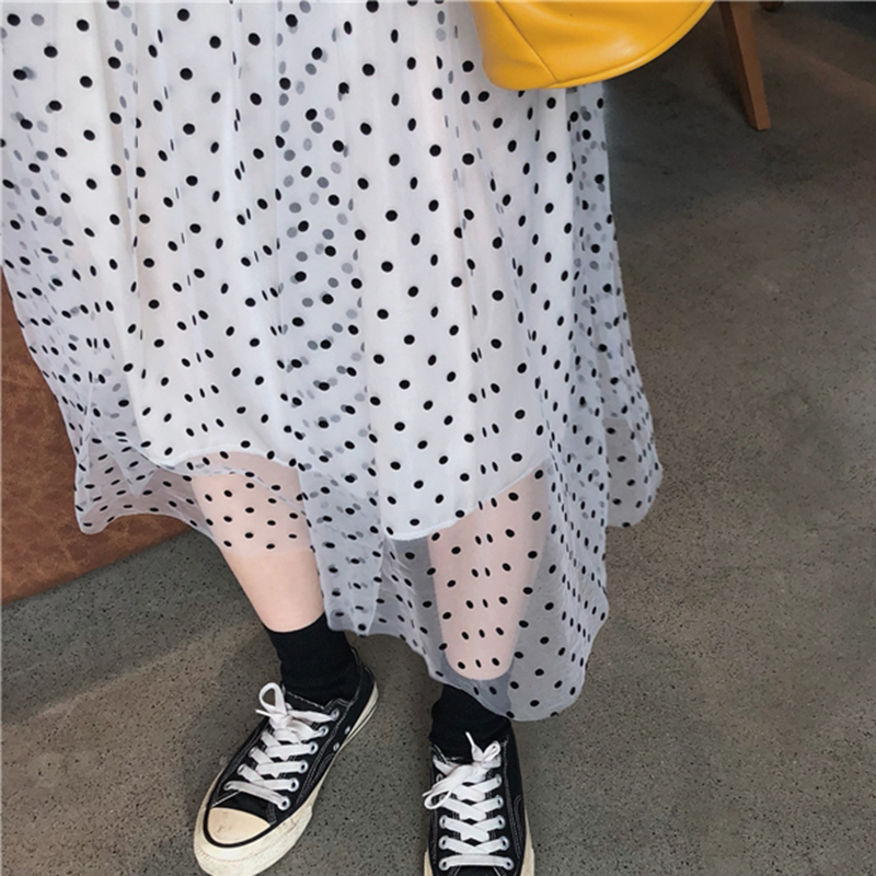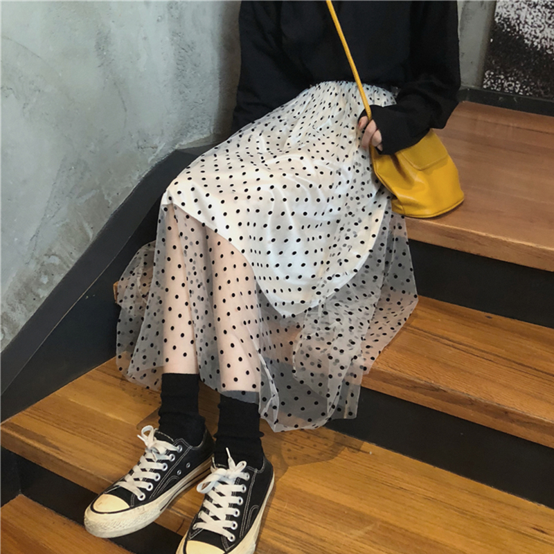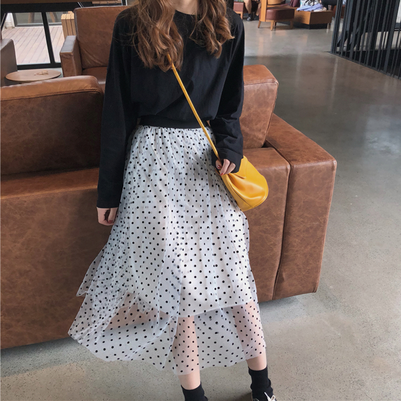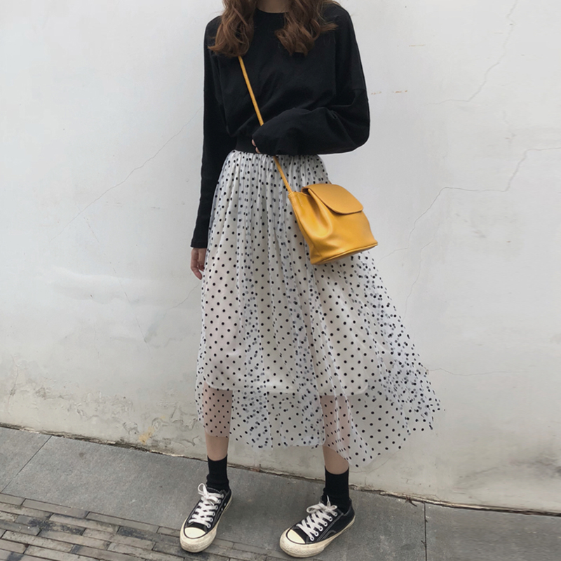 / 秋裝女2018新款韓版學生高腰波點網紗半身裙時尚氣質中長A字裙子