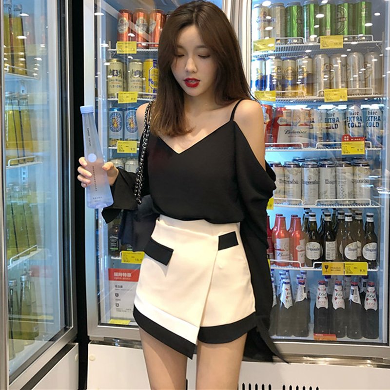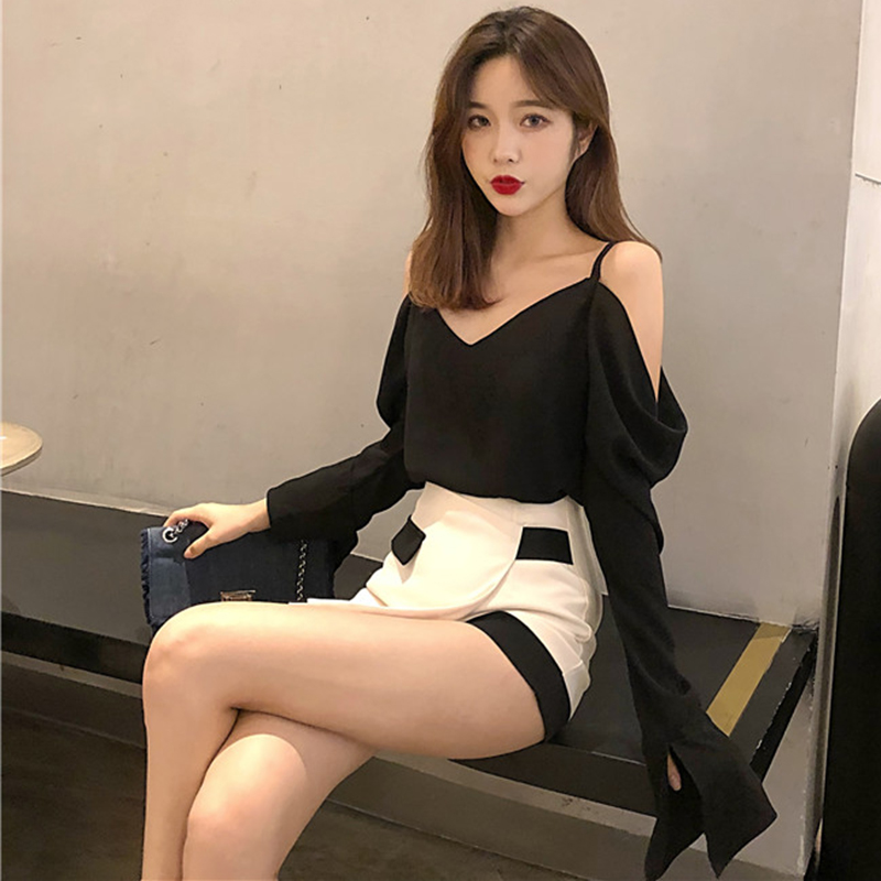 / 早秋復古套裝新款氣質V領吊帶漏肩長袖上衣韓版短裙褲時尚兩件套