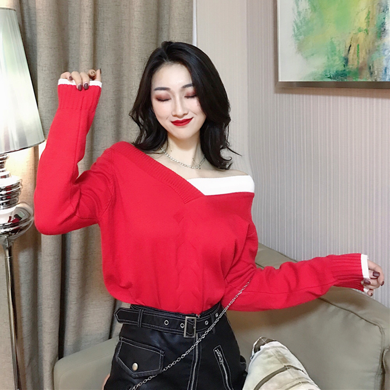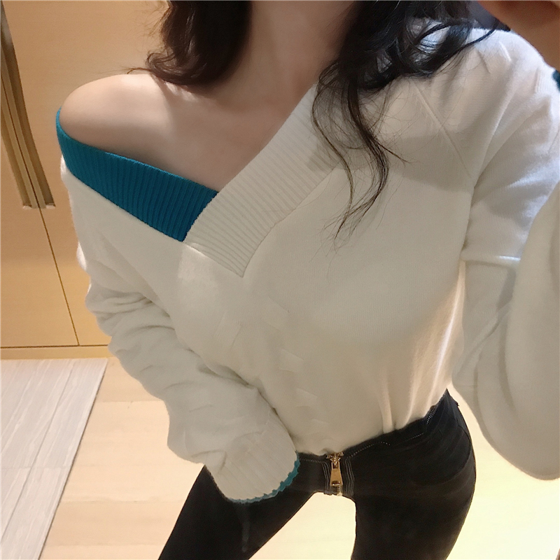 / 氣質chic拼色針織衫女秋冬裝2018新款韓版時尚寬松V領毛衣外套潮