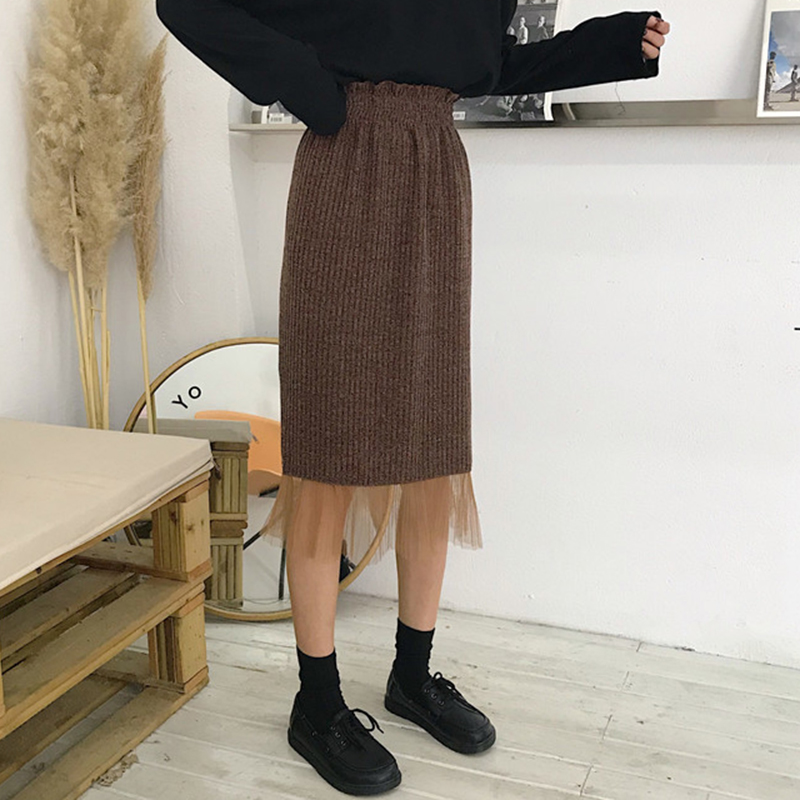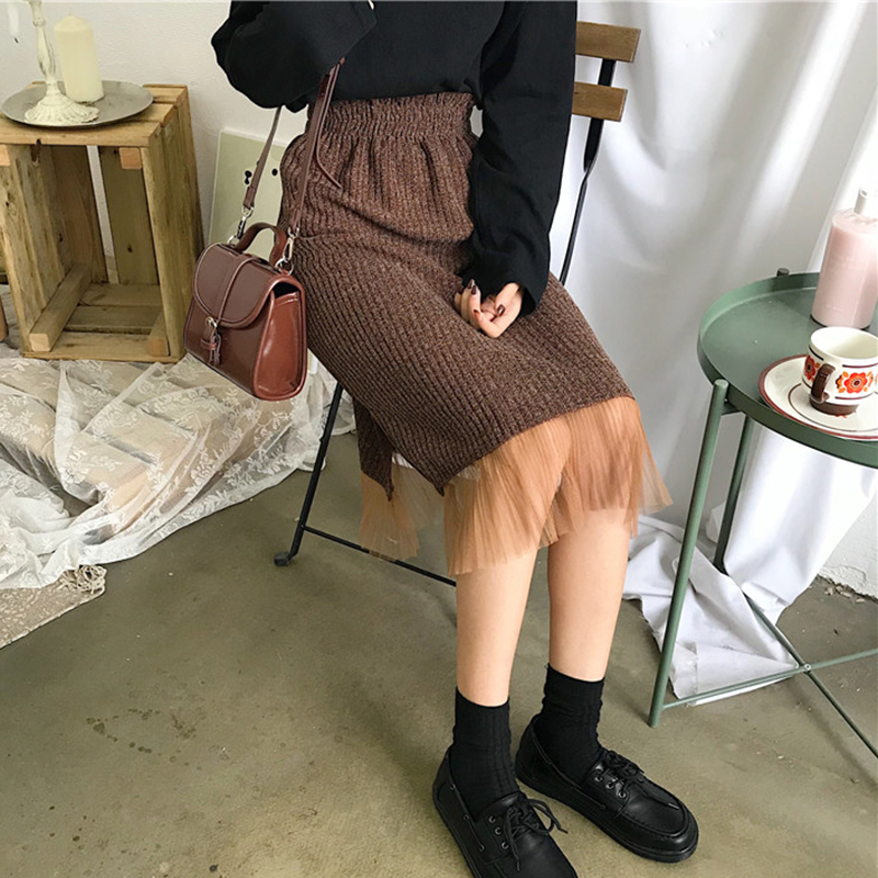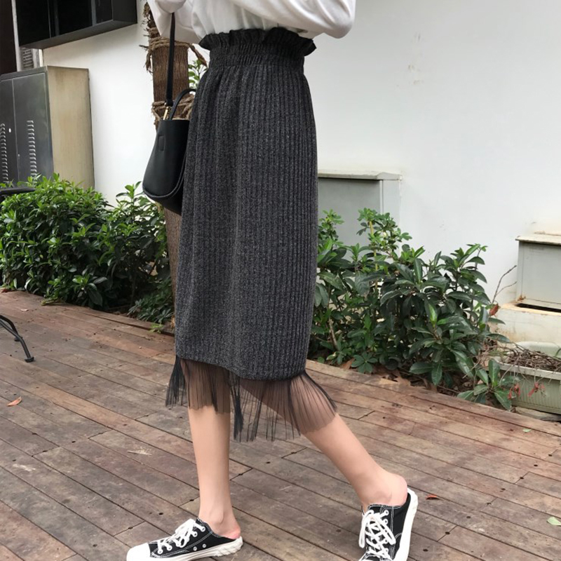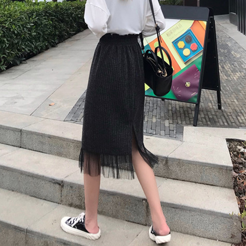 / 氣質黑色半身裙女秋裝2018新款網紗拼接顯瘦高腰時尚a字中長裙子
