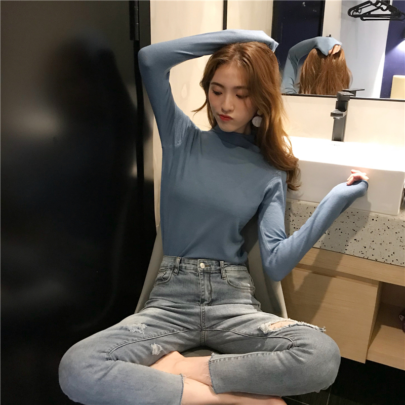 早秋上衣女慵懶長袖t袖女百搭韓版糖果色氣質高領加絨加厚打底衫
