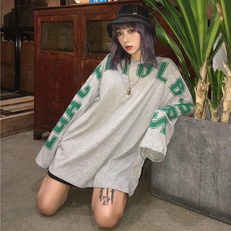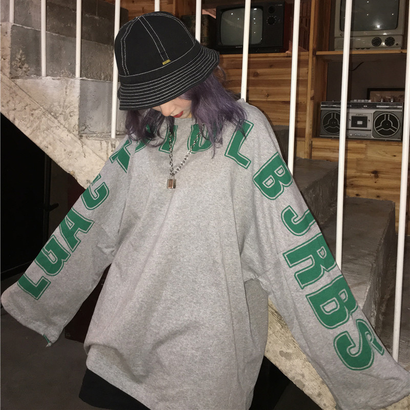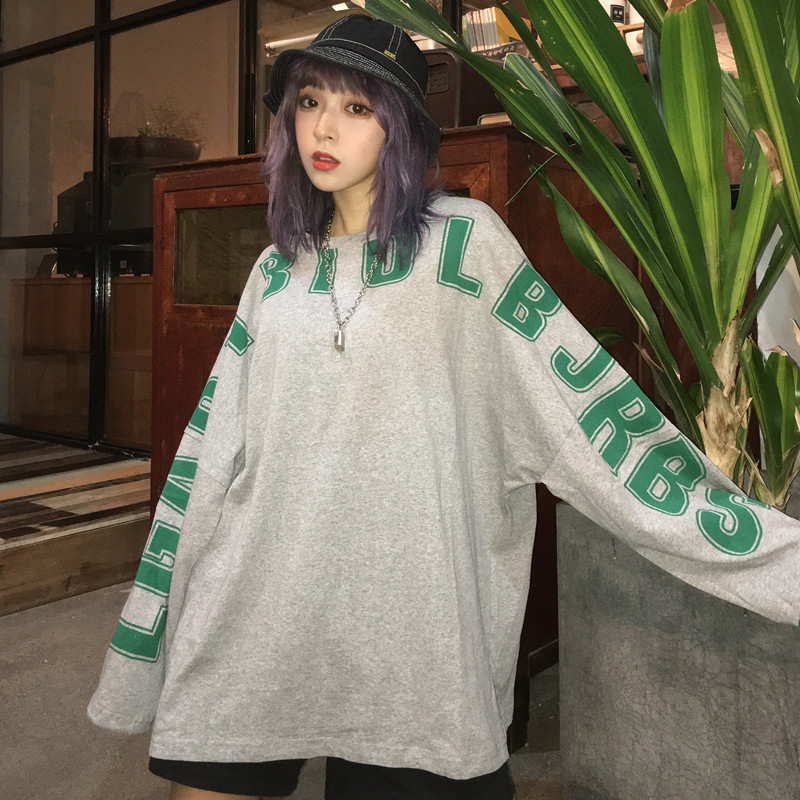 / 時尚抽繩字母印花T恤女秋冬裝新款學生寬松長袖上衣外穿套頭體恤