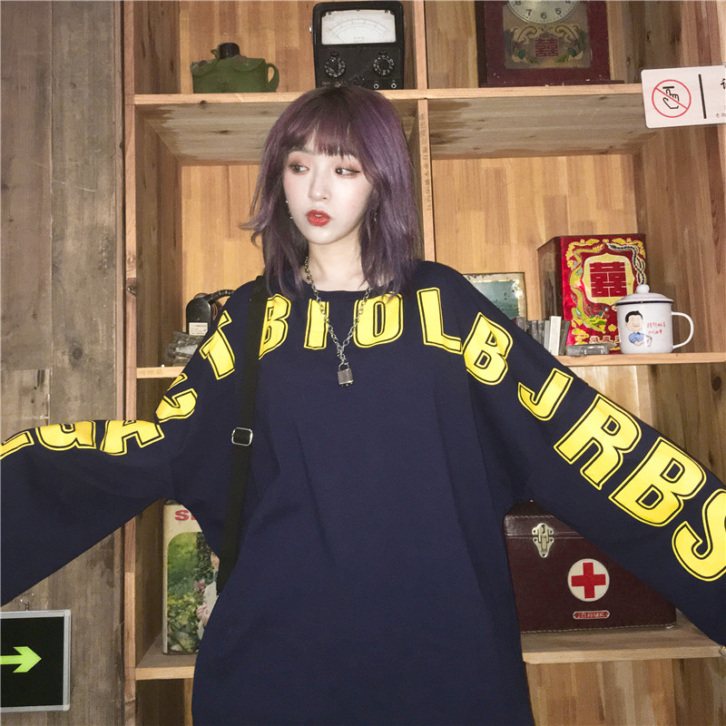 時尚抽繩字母印花T恤女秋冬裝新款學生寬松長袖上衣外穿套頭體恤