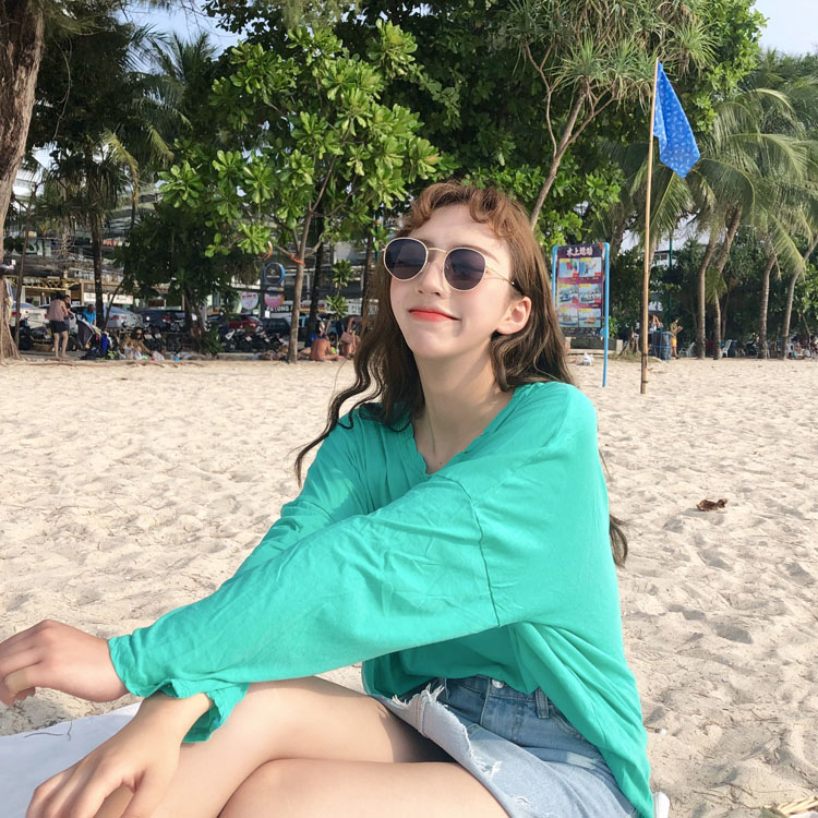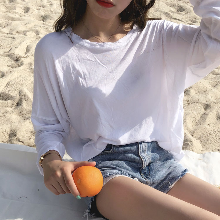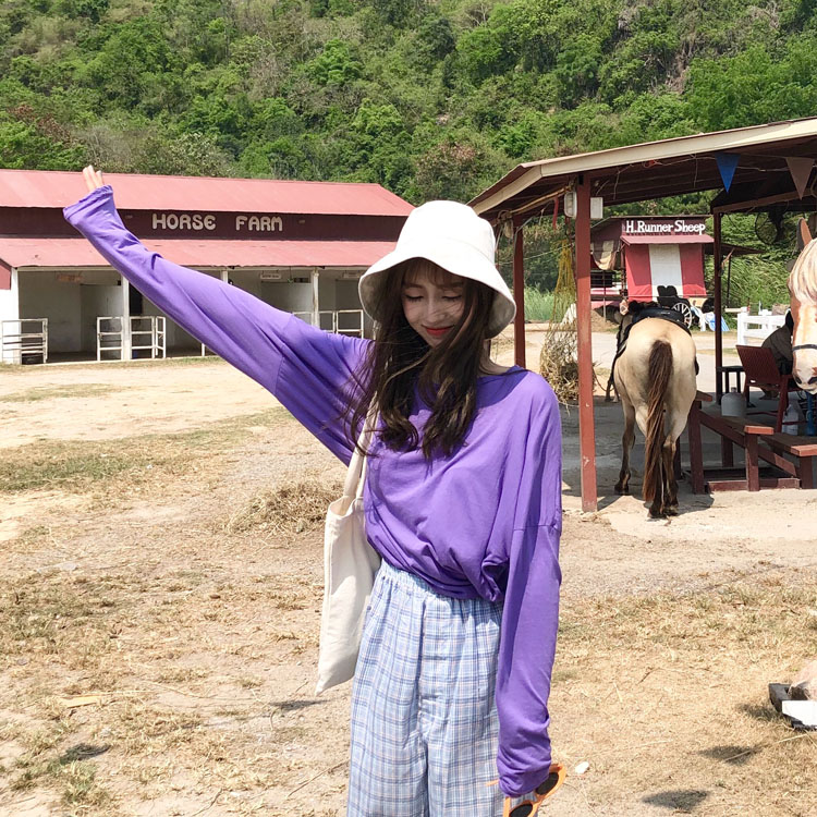 夏季新款女裝寬松顯瘦學生長袖套頭T恤純色百搭薄款防曬衫罩衫女