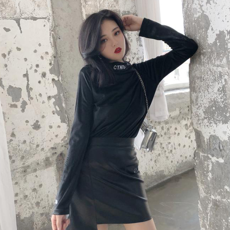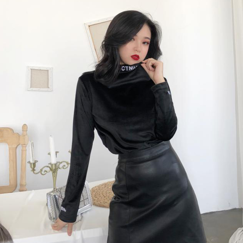 / 中長款字母刺繡上衣秋裝女2018新款港味修身打底衫小高領長袖T恤