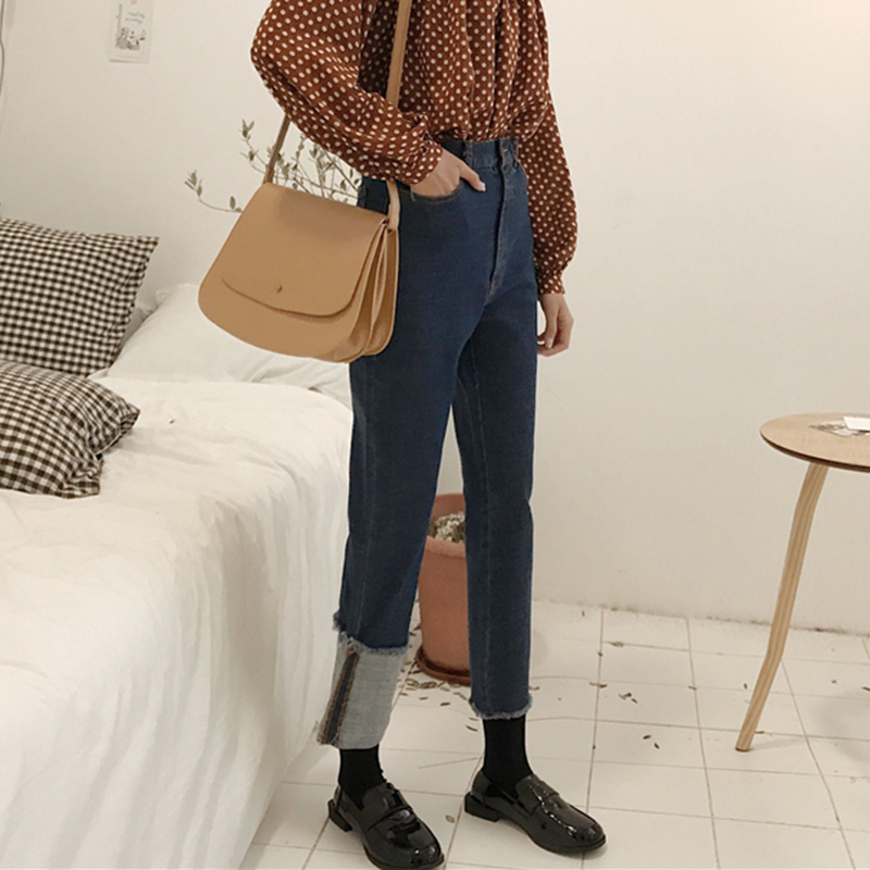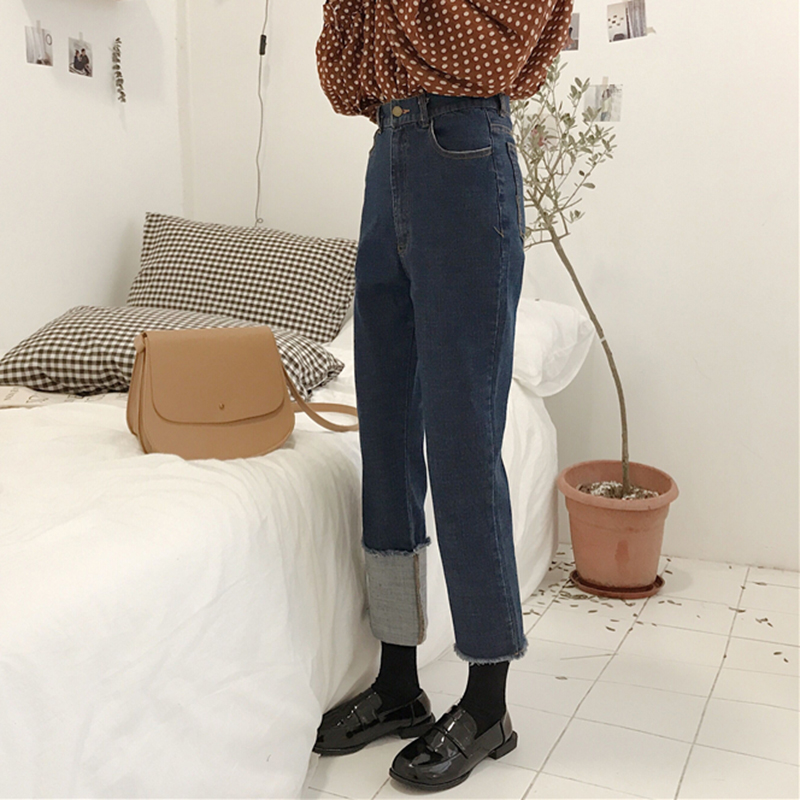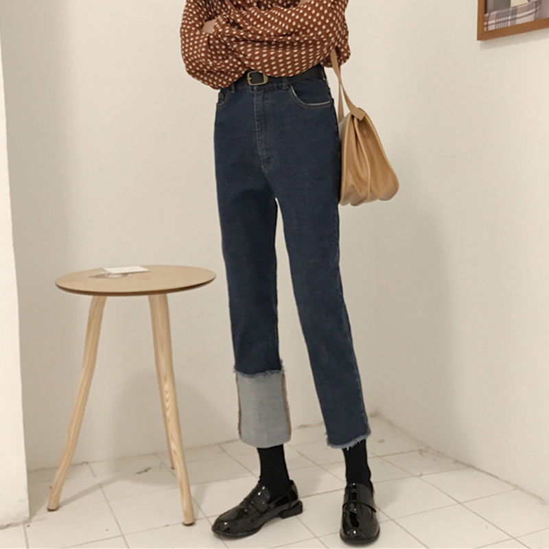 不對稱褲腳牛仔褲女秋冬裝2018新款韓版高腰寬松顯瘦直筒九分褲子