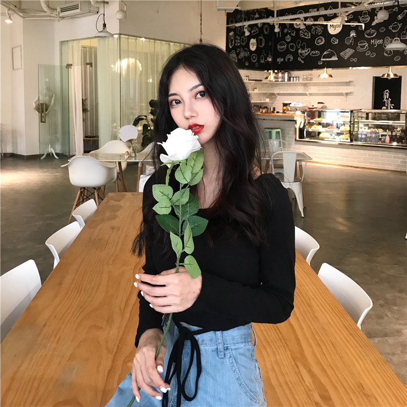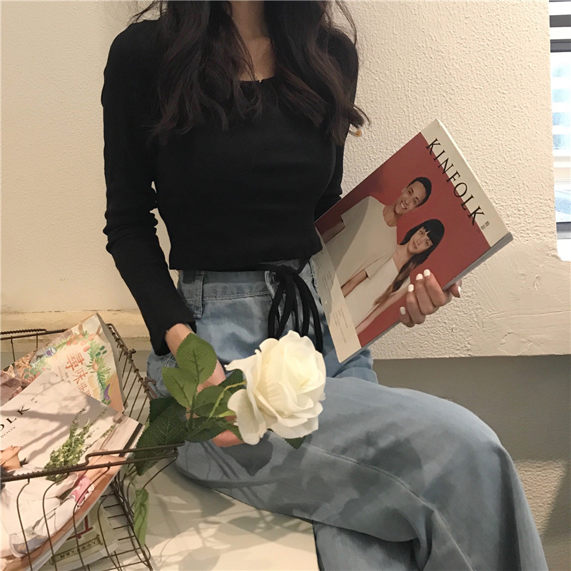 / 港味秋天上衣女時尚復古風修身顯瘦純色綁繩圓領百搭長袖打底T恤