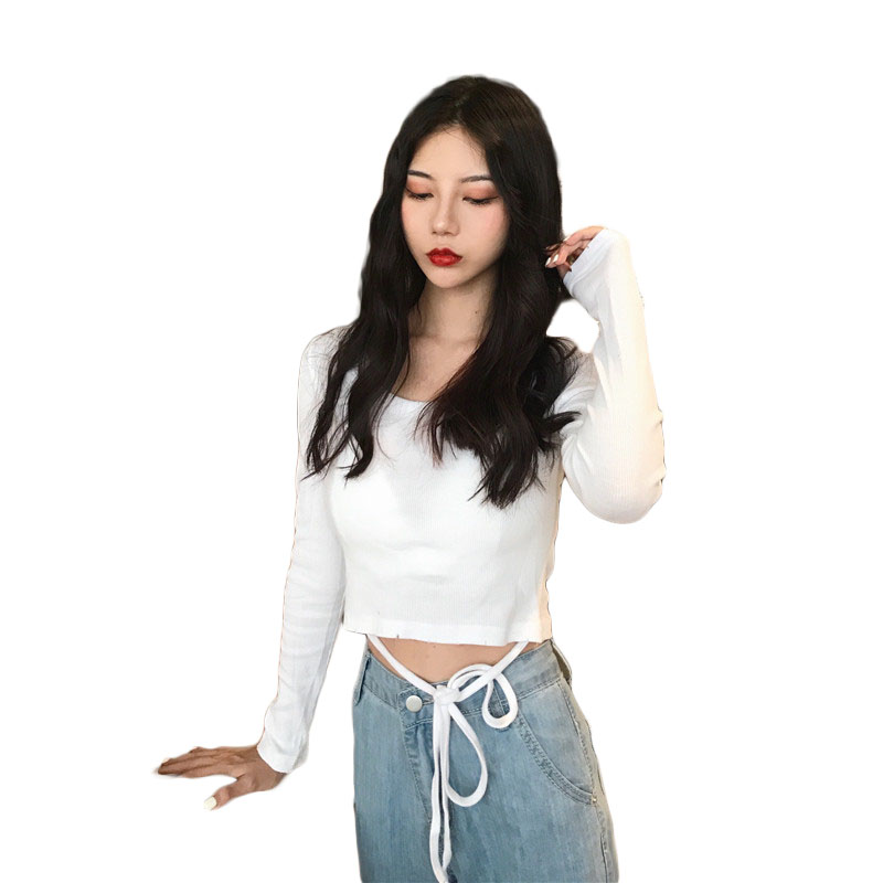 港味秋天上衣女時尚復古風修身顯瘦純色綁繩圓領百搭長袖打底T恤