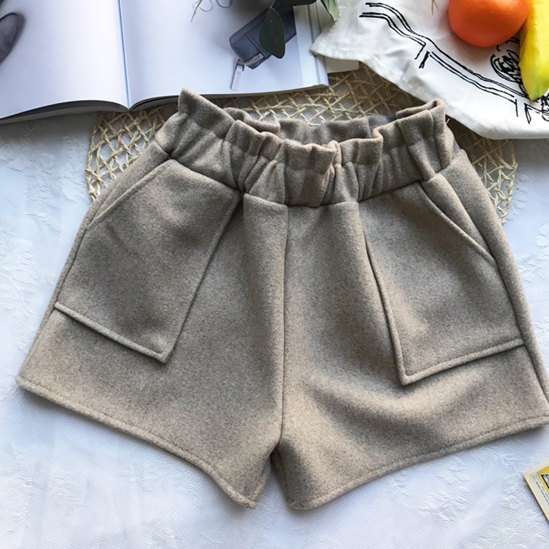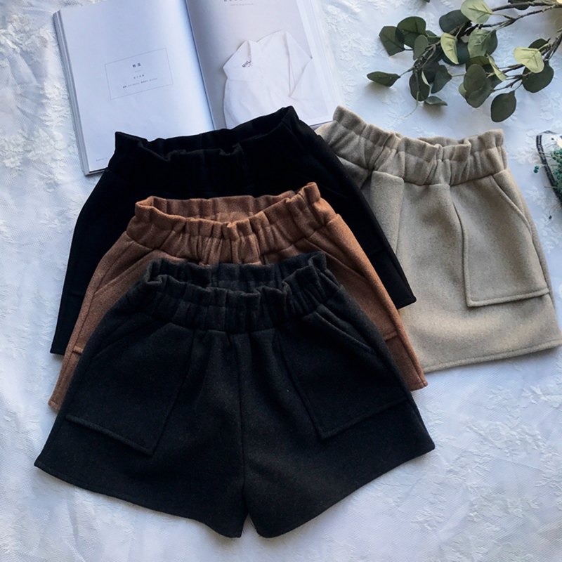 / 韓版黑色高腰顯瘦闊腿短褲子女秋冬裝新款學生復古風毛呢休閑靴褲