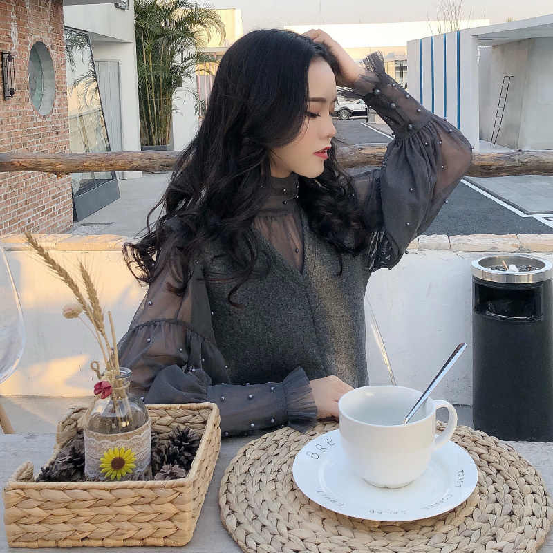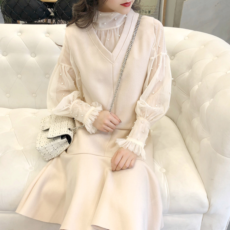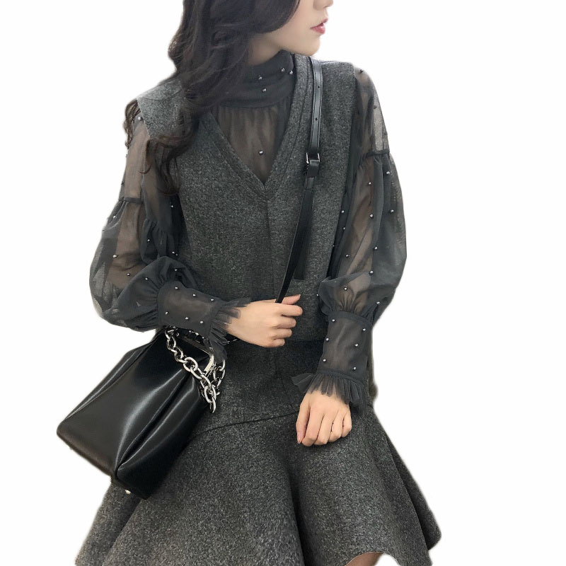 chic風秋裝女2018新款仙女氣質長袖雪紡衫+魚尾背心連衣裙兩件套