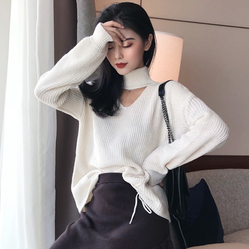 / 鏤空高領慵懶套頭毛衣女秋冬裝新款系帶純色寬松針織外套長袖上衣