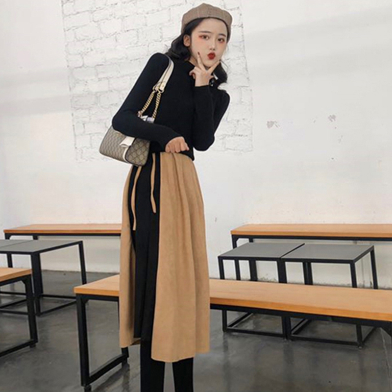御姐套裝女秋冬新款拼接V領吊帶連衣裙子修身顯瘦黑色長袖T恤上衣