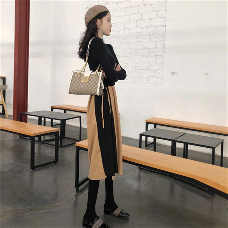 / 御姐套裝女秋冬新款拼接V領吊帶連衣裙子修身顯瘦黑色長袖T恤上衣