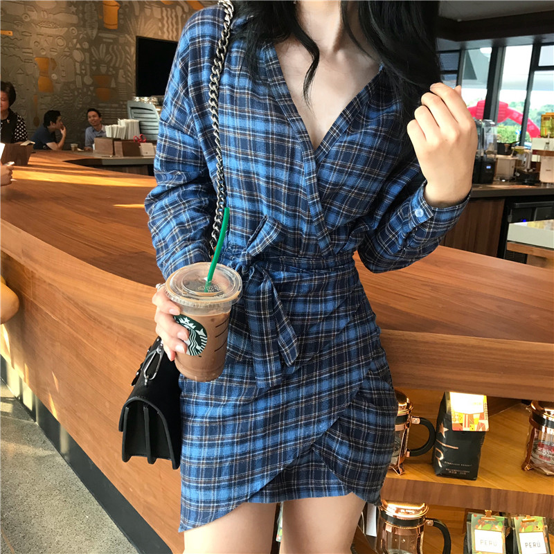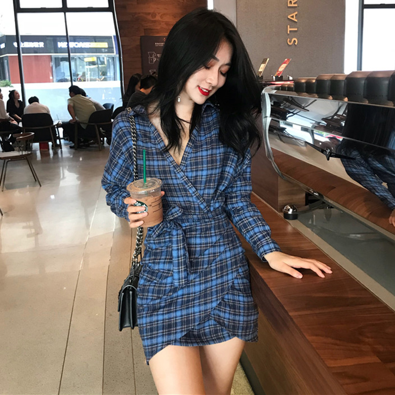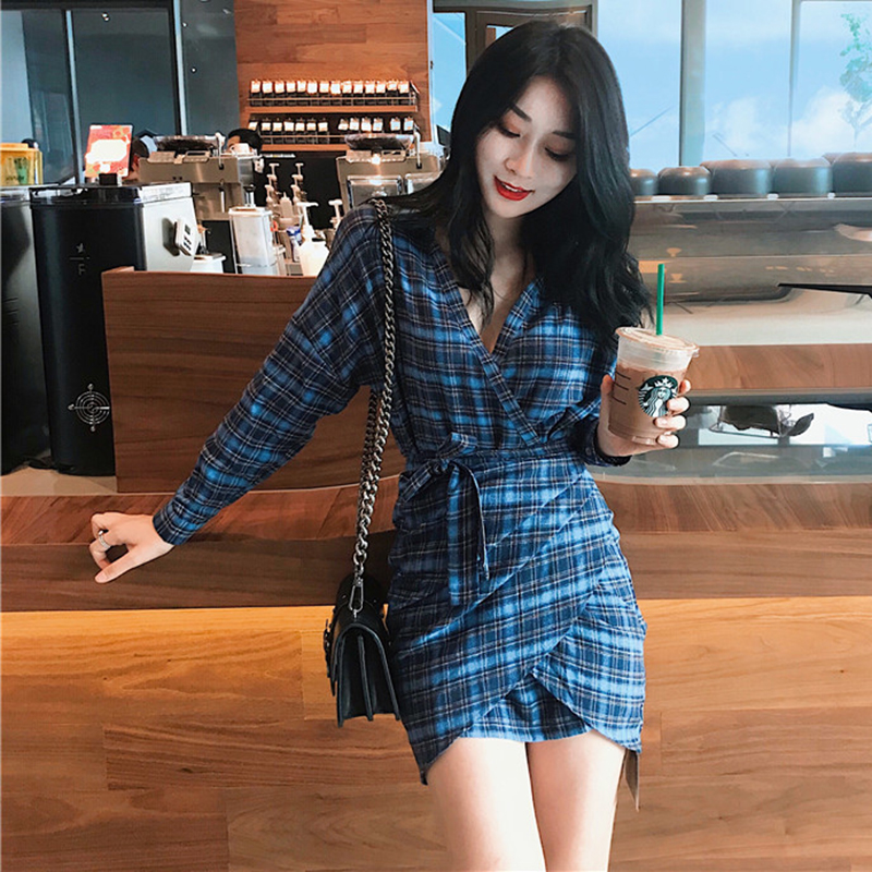 / 秋天2018新款女裝港味溫柔復古格子V領連衣裙氣質高腰包臀短裙子