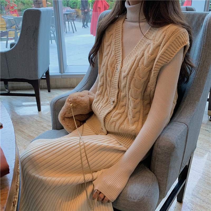 / 復古女神套裝秋冬新款百搭毛衣背心+針織高領打底+高腰一步針織裙