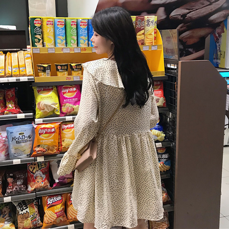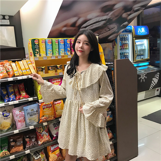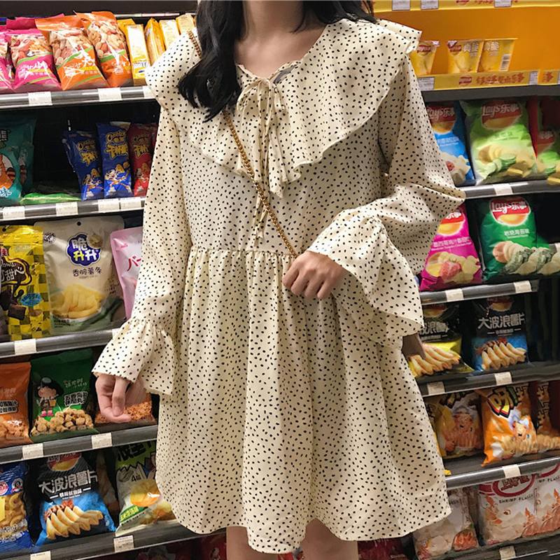 / 小清新波點連衣裙秋裝女2018新款甜美荷葉領系帶長袖娃娃A字裙子