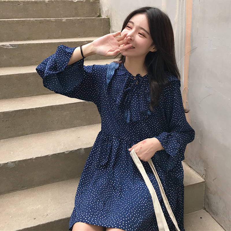 小清新波點連衣裙秋裝女2018新款甜美荷葉領系帶長袖娃娃A字裙子