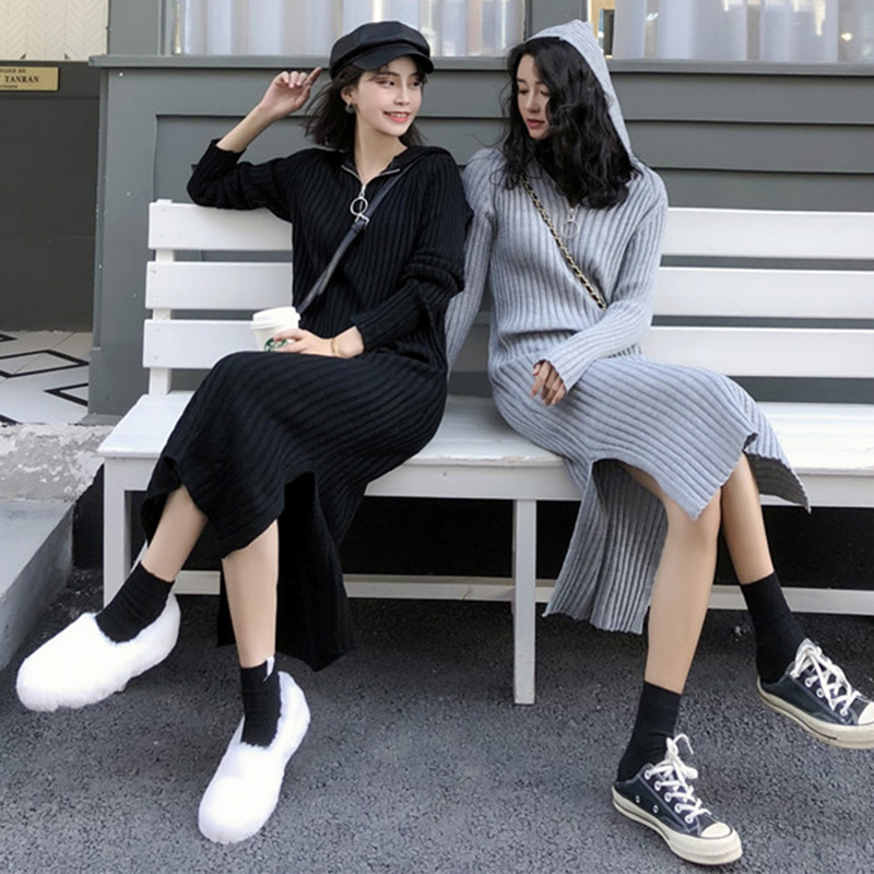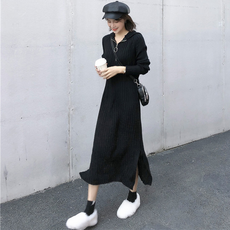 / eeg中長款開叉連衣裙子女秋冬裝2018新款韓版黑色顯瘦連帽針織裙