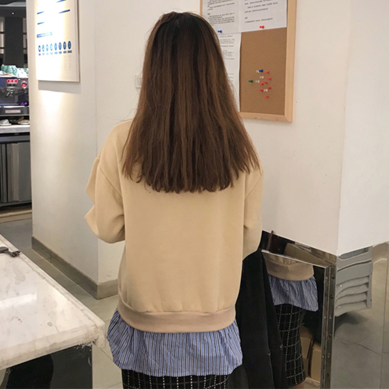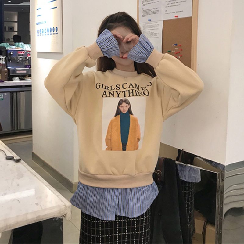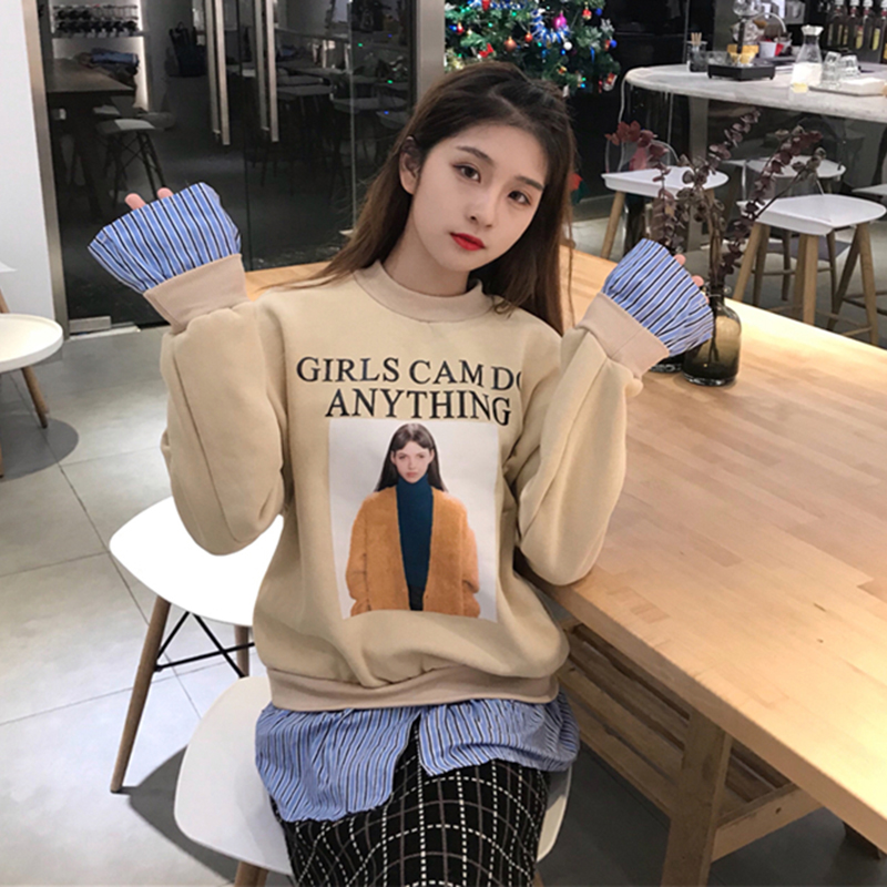 秋冬女裝2018新款寬松字母人物印花衛衣假兩件拼接條紋荷葉袖外套