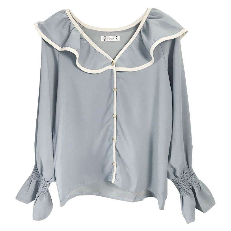 / 秋裝新款韓版小清新甜美荷葉邊V領喇叭袖純色長袖女裝雪紡衫襯衣