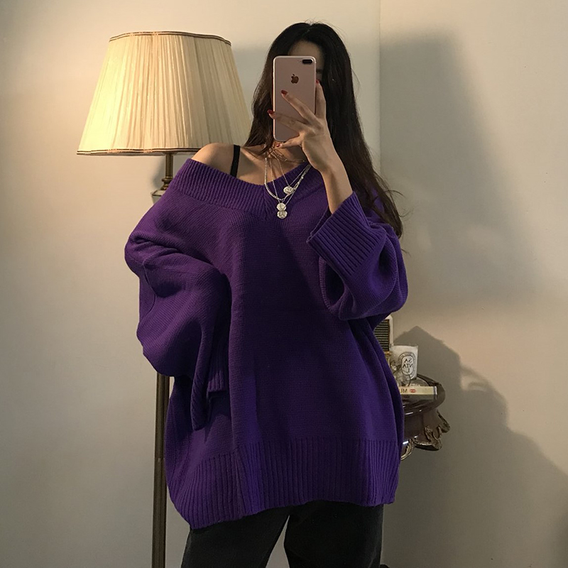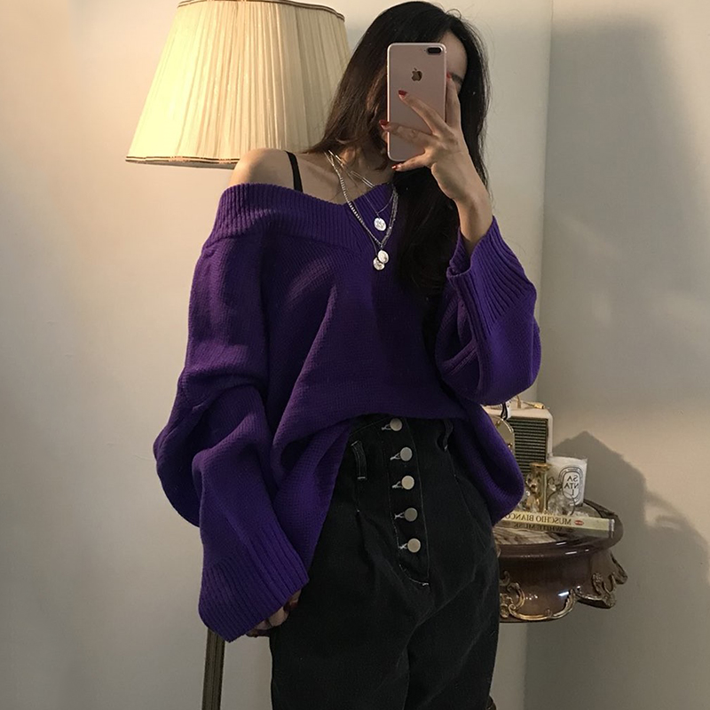 / 韓版寬松純色針織衫秋裝女新款慵懶風套頭毛衣漏鎖骨V領長袖上衣
