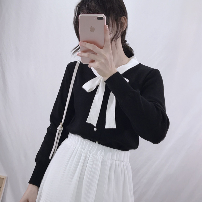 / 時尚撞色蝴蝶結針織開衫秋裝女2018新款韓版chic氣質修身長袖上衣