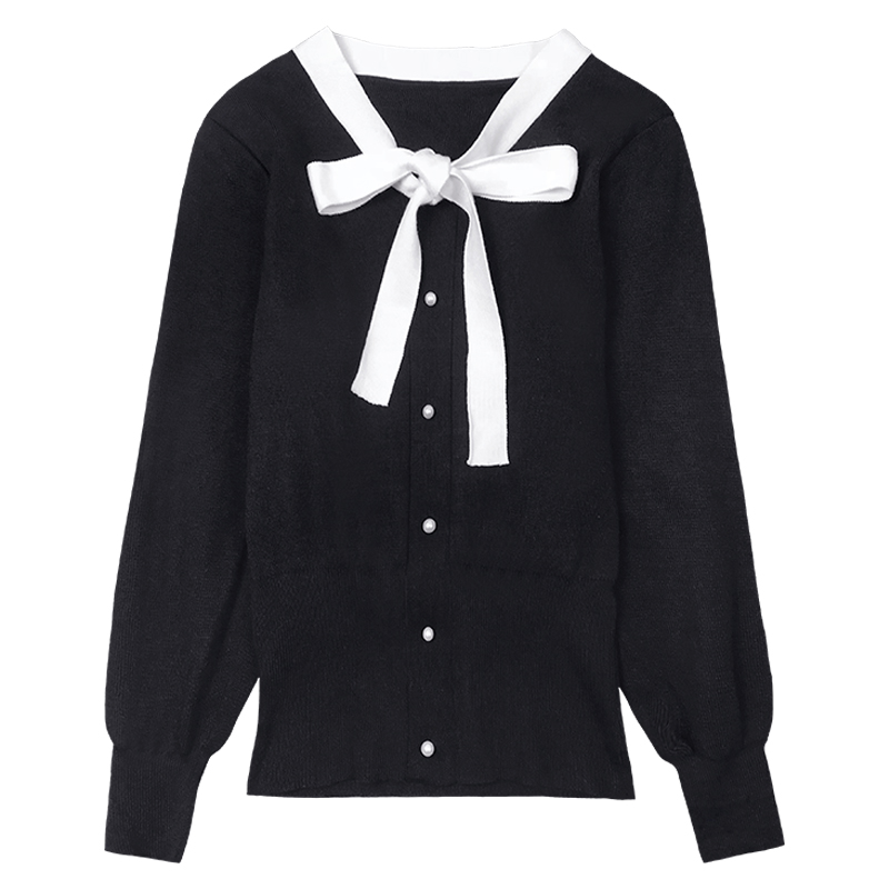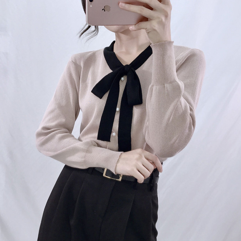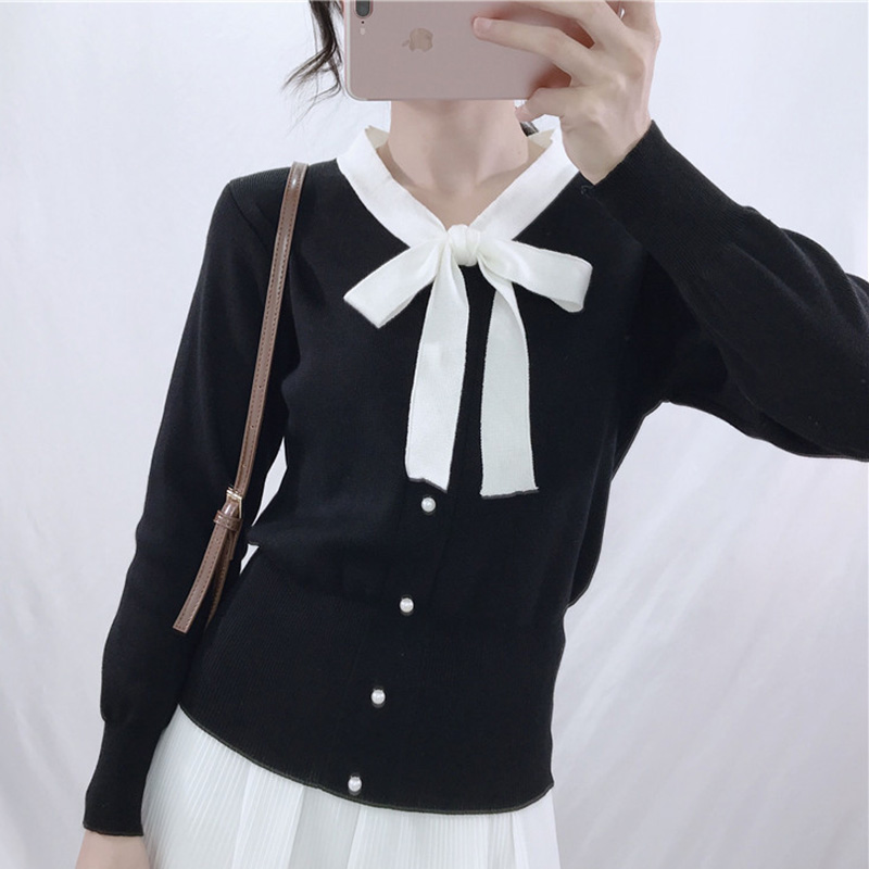 時尚撞色蝴蝶結針織開衫秋裝女2018新款韓版chic氣質修身長袖上衣