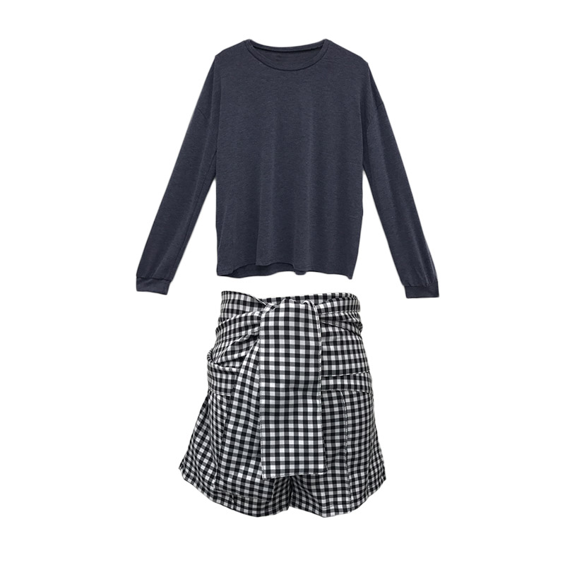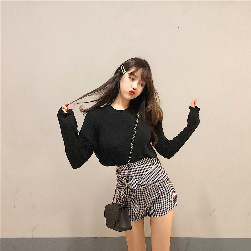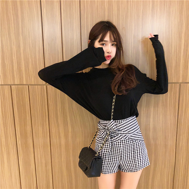/ 新款時尚套裝寬松學生百搭長袖上衣+顯瘦系帶高腰格子短褲分開拍