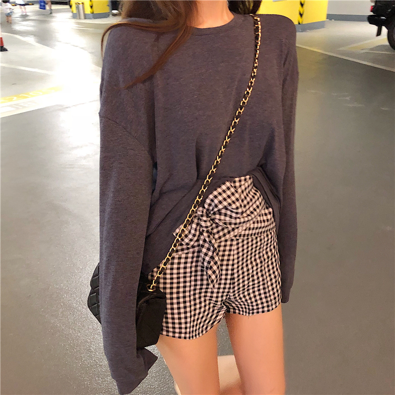 新款時尚套裝寬松學生百搭長袖上衣+顯瘦系帶高腰格子短褲分開拍