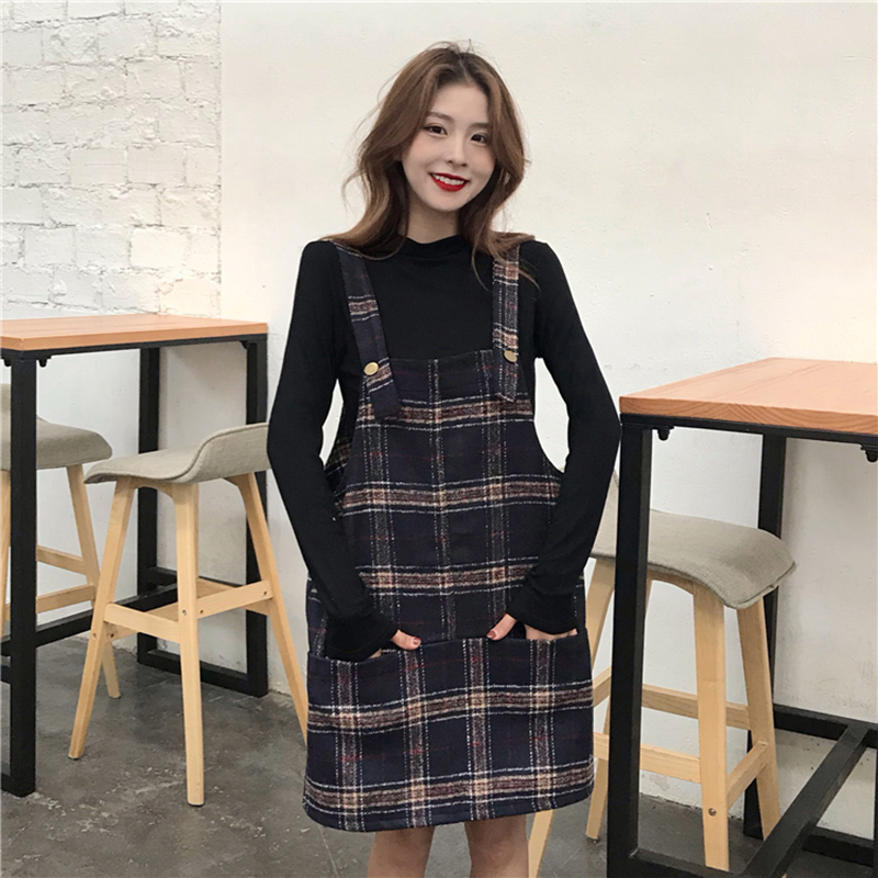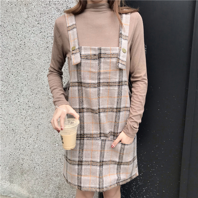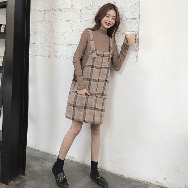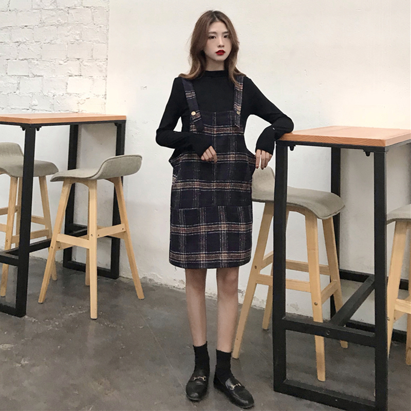 洋氣套裝女冬裝2018新款半高領長袖打底衫毛呢復古格子背帶短裙子