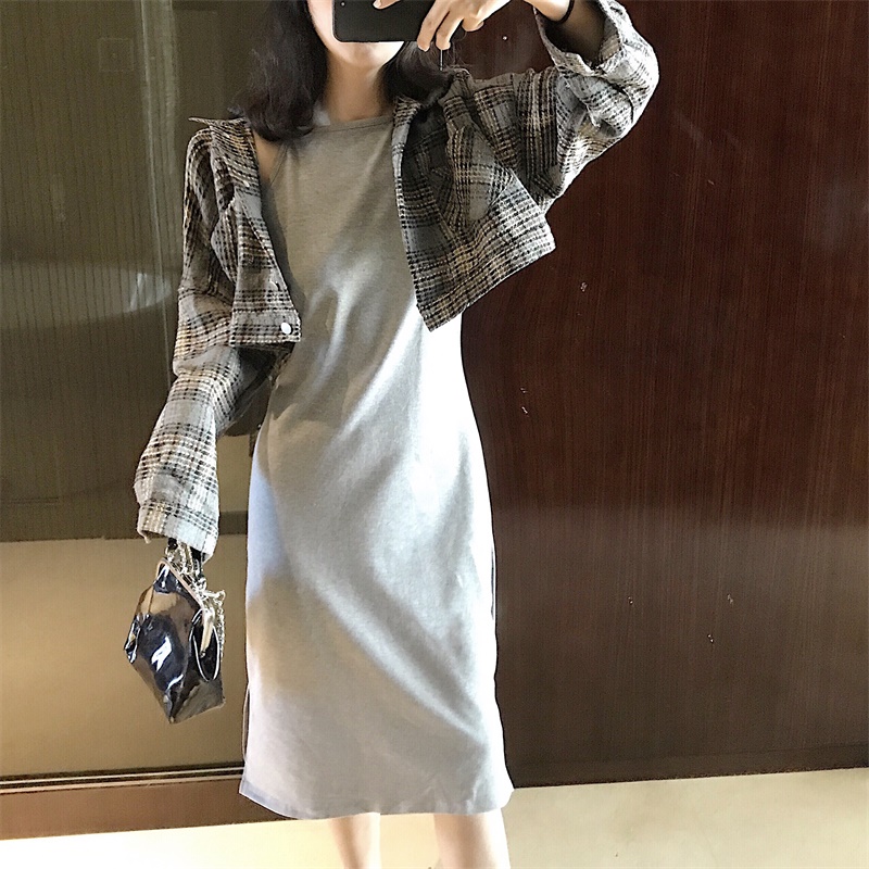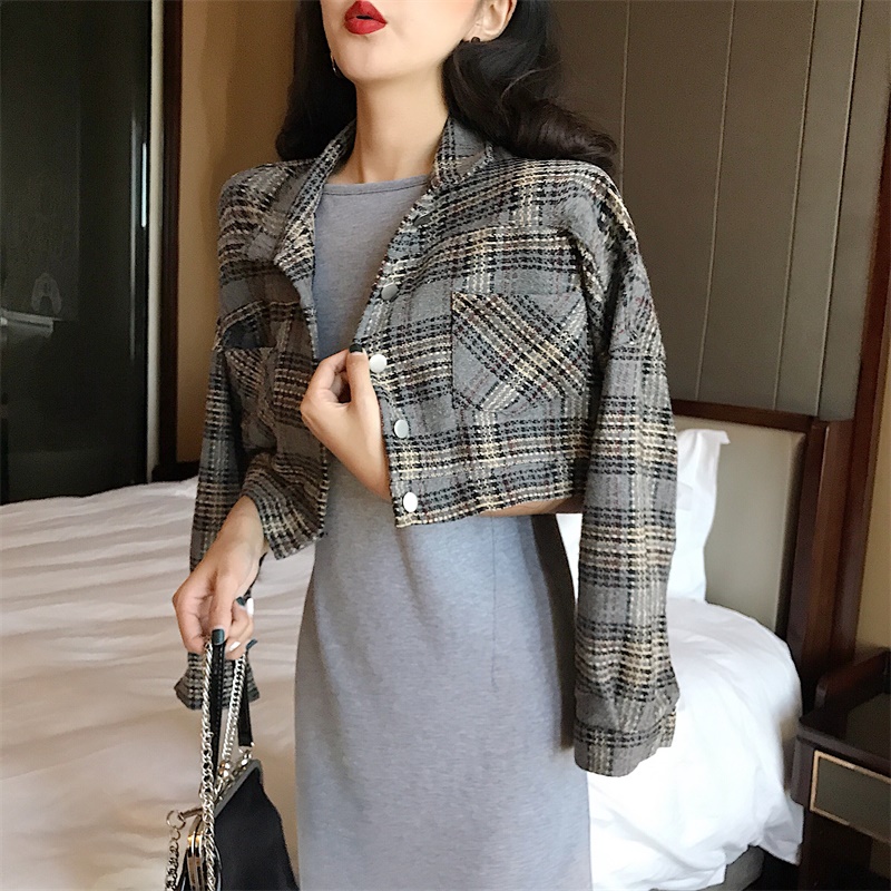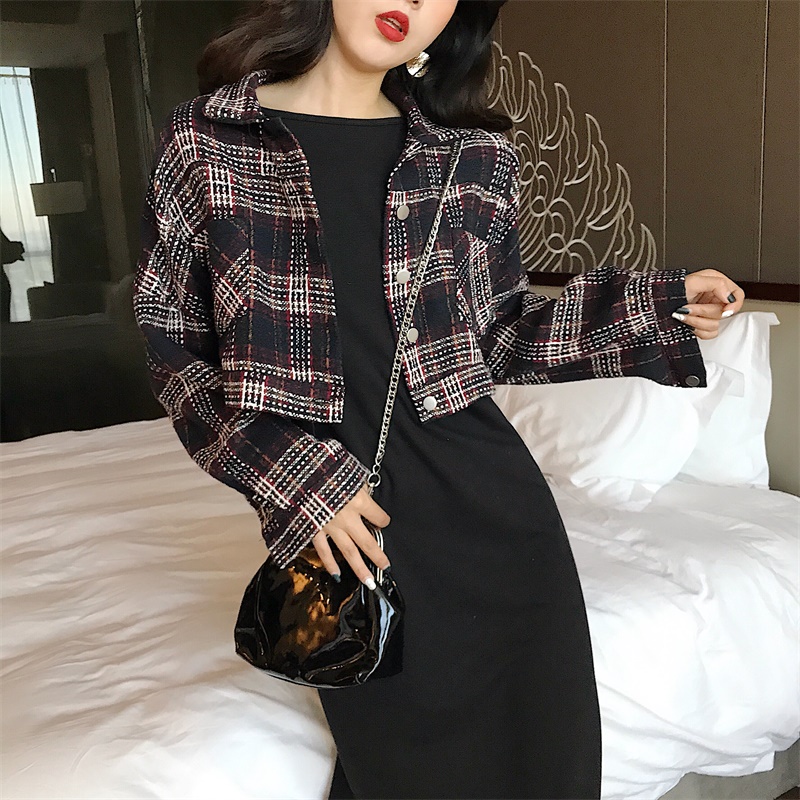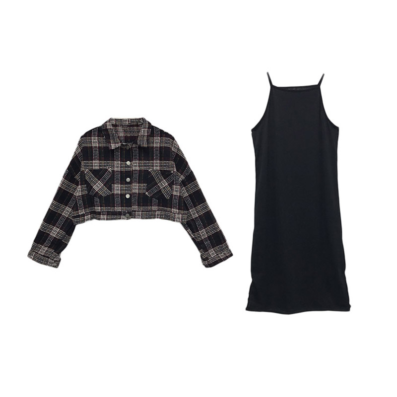 短款復古格子毛呢外套+寬松百搭呢子夾克吊帶裙時尚套裝兩件套潮