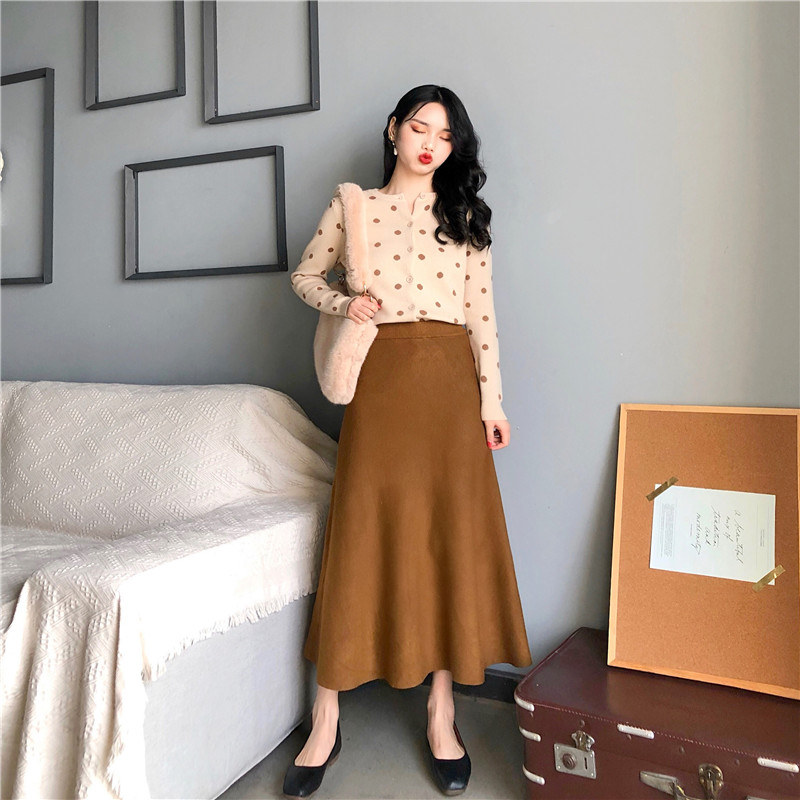 韓國ulzzang單排扣百搭波點針織開衫外套女+高腰中長半裙復古套裝