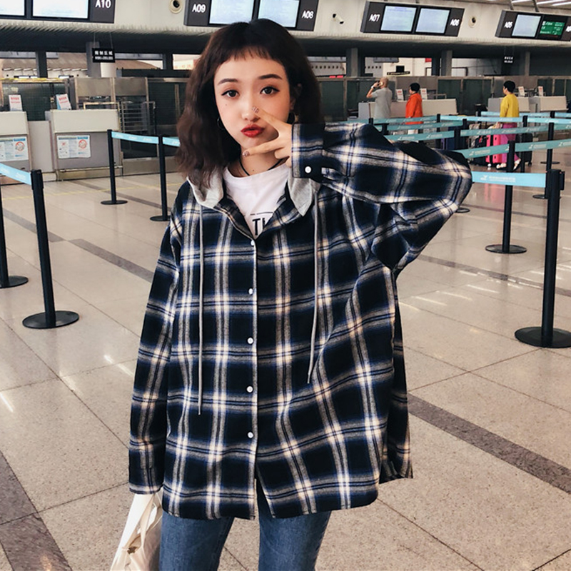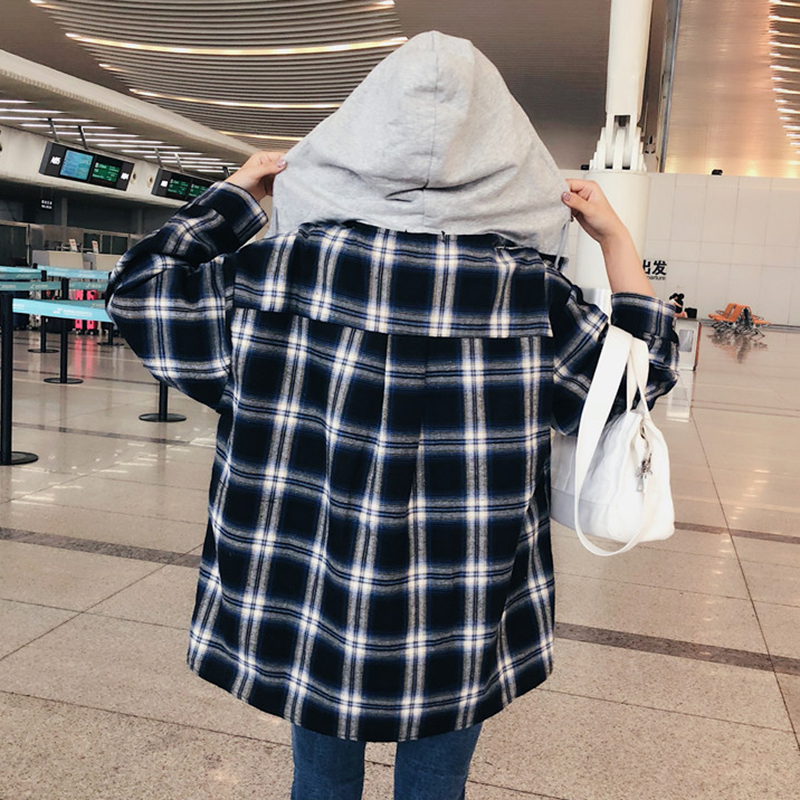 / 時尚磨毛假兩件格子襯衫女秋裝新款休閑外套學生百搭寬松長袖上衣