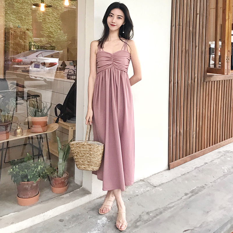/ 夏季新款女裝多肩帶收腰顯瘦抽褶抹胸純裙子色學生吊帶連衣裙長裙